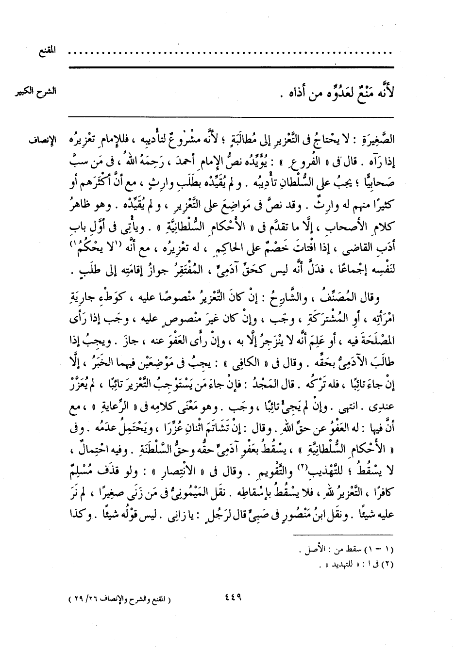 وقال المُصَنِّفُ، والشَّارحُ: إنْ كانَ التَّعْزيرُ منْصوصًا عليه، كوَطْءِ جارِيَةِ امْرَأتِه، أوِ المُشْترَكَةِ، وتجب، وإنْ كان غيرَ منْصوصٍ عليه، وجَب إذا رَأى المصْلَحَةَ فيه، أو عَلِمَ أنَّه لا ينْزَجِرُ إلَّا به، وإنْ رأى العَفْوَ عنه، جازَ. ويجِبُ إذا طالَبَ الآدَمِىُّ بحَقِّه. وقال فى «الكافِى»: يجِبُ فى مَوْضعَيْن فيهما الخَبَرُ، إِلَّا إنْ جاءَ تائِبًا، فله تَرْكُه. قال المَجْدُ: فإنْ جاءَ مَن يَسْتَوْجِبُ التَّعْزيرَ تائِبًا، لم يُعَزَّرْ عندِى. انتهى. وإنْ لم يَجِئْ تائِبًا، وجَب. وهو مَعْنَى كلامِه فى «الرِّعايَةِ»، مع أنَّ فيها: له العَفْوُ عن حقِّ اللَّهِ. وقال: إنْ تَشَاتَمَ اثْنانِ عُزِّرَا، ويَحْتَمِلُ عدَمُه. وفى «الأَحْكامِ السُّلْطانِيَّةِ»، يسْقُطُ بعَفْوِ آدَمِىِّ حقُّه وحقُّ السَّلْطَنَةِ. وفيه احْتِمالٌ، لا يسْقُطُ؛ للتَّهْذيبِ (¬2) والتَّقْويمِ. وقال فى «الانْتِصارِ»: وِلو قذَف مُسْلِمٌ كافرًا، التَّعْزيرُ للَّهِ، فلا يسْقُطُ بإسْقاطِه. نقَل المَيْمُونِىُّ فى مَن زَنى صغِيرًا، لم نرَ عليه شيئًا. ونقَل ابنُ مَنْصُورٍ فى صَبِىٍّ قال لرَجُلٍ: يا زانِى. ليس قوْلُه شيئًا. وكذا