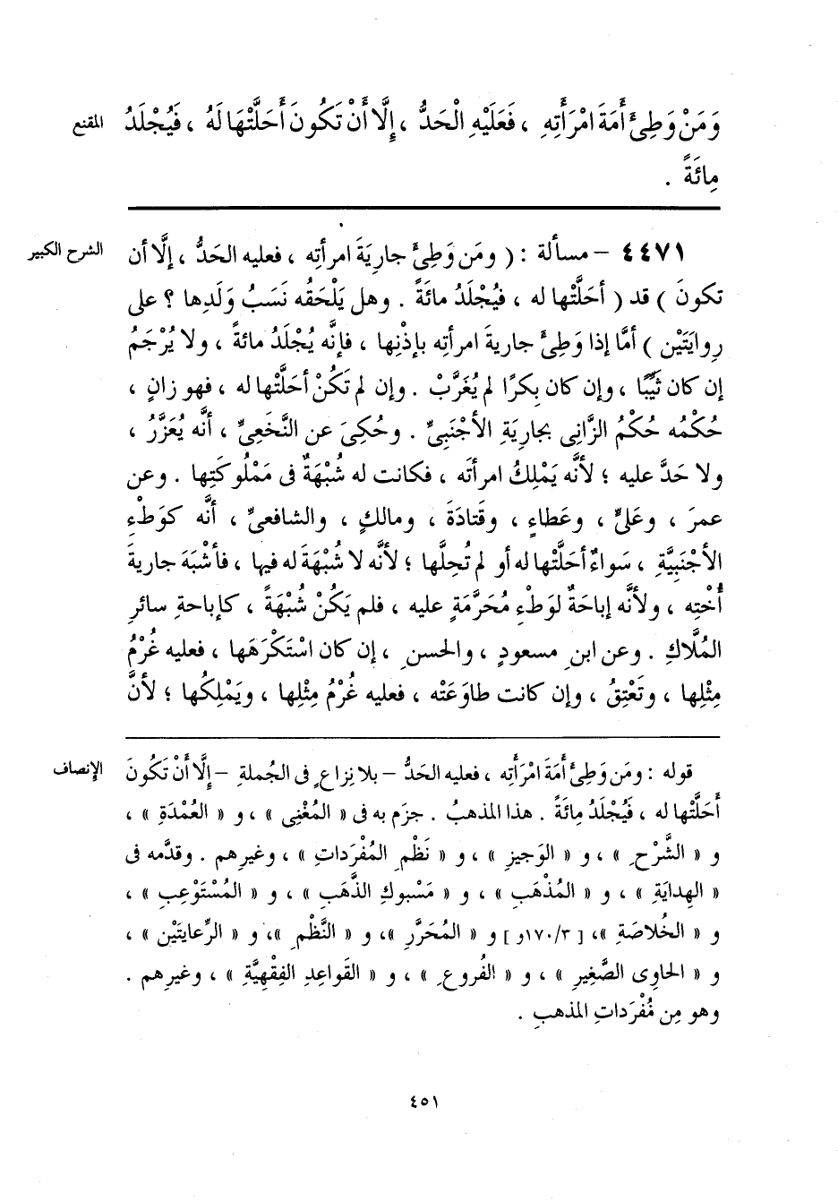 قوله: ومَن وَطِئَ أمَةَ امْرَأَتِه، فعليه الحَدُّ -بلا نِزاعٍ فى الجُملةِ- إِلَّا أَنْ تَكُونَ أَحلَّتْها له، فَيُجْلَدُ مِائَةً. هذا المذهبُ. جزَم به فى «المُغْنِى»، و «العُمْدَةِ»، و «الشَّرْحِ»، و «الوَجيزِ»، و «نَظْمِ المُفْرَداتِ»، وغيرِهم. وقدَّمه فى «الهِدايَةِ»، و «المُذْهَبِ»، و «مَسْبوكِ الذَّهَبِ»، و «المُسْتَوْعِبِ»، و «الخُلاصَةِ»، و «المُحَرَّرِ»، و «النَّظْمِ»، و «الرِّعايتَيْن»، و «الحاوِى الصَّغِيرِ»، و «الفُروعِ»، و «القَواعِدِ الفِقْهِيَّةِ»، وغيرِهم. وهو مِن مُفرَداتِ المذهبِ.