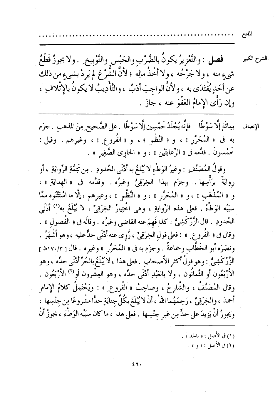 وقولُ المُصَنِّفِ: وغيرُ الوَطْءِ لا يُبْلغُ به أدْنَى الحُدودِ. مِن تَتِمَّةِ الرِّوايَةِ، أو رِوايَةٌ برَأْسِها. وجزَم بهذا الخِرَقِىُّ وغيرُه. وقدَّمه فى «الهِدايَةِ»، و «المُذْهَبِ»، و «المُحَرَّرِ»، و «النَّظْمِ»، وغيرِهم، إلَّا ما اسْتَثْنُوه ممَّا سبَبُه الوَطْءُ. فعلى هذه الرِّوايةِ، وهى اخْتِيارُ الخِرَقِىِّ، لا يُبْلَغُ به (¬1) أدْنَى الحُدودِ. قال الزَّرْكَشِىُّ: كذا فَهِمَ عنه القاضى وغيرُه. وقالَه فى «الفُصولِ». وقال فى «الفُروعِ»: فعلى قولِ الخِرَقِىِّ، رُوِى عنه أدْنَى حدٍّ عليه، وهو أشْهَرُ. ونصَرَه أبو الخَطَّابِ وجماعةٌ. وجزَم به فى «المُحَرَّرِ» وغيرِه. قال الزَّرْكَشِىُّ: وهو قولُ أكثرِ الأصحابِ. فعلى هذا، لا يُبْلَغُ بالحُرِّ أدْنَى حدِّه، وهو الأرْبَعُون أو الثَّمانُون، ولا بالعَبْدِ أدْنَى حدِّه، وهو العِشْرون أوِ (¬2) الأرْبَعُون. وقال المُصَنِّفُ، والشَّارِحُ، وصاحِبُ «الفُروعِ»: ويَحْتَمِلُ كلامُ الإِمامِ أحمدَ، والخِرَقِىِّ، رَحِمَهُما اللَّهُ، أَنْ لا يبلَغَ بكُلِّ جِنايَةٍ حدًّا مشْروعًا مِن جِنْسِها، ويجوزُ أَنْ يَزيدَ على حدٍّ مِن غيرِ جِنْسِها. فعلى هذا، ما كان سبَبُه الوَطْءَ، يجوزُ أَنْ