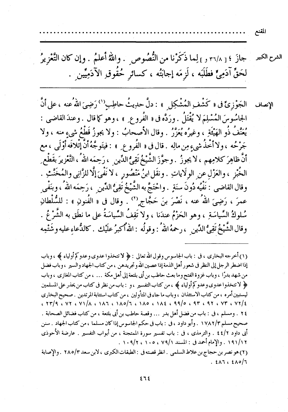 الجَوْزِىِّ فى «كَشْفِ المُشْكِلِ»: دلَّ حدِيثُ حاطِبٍ (¬1) رَضىَ اللَّهُ عنه، على أنَّ الجاسُوسَ المُسْلِمَ لا يُقْتَلُ. ورَدَّه فى «الفُروعِ»، وهو كما قال. وعندَ القاضى: يُعَنَّفُ ذُو الهَيْئَةِ، وغيرُه يُعَزَّرُ. وقال الأصحابُ: ولا يجوزُ قَطعُ شئٍ منه، ولا جَرْحُه، ولا أخْذُ شئٍ مِن مالِه. قال فى «الفُروعِ»: فيتَوجَّهُ أن إتْلافَه أوْلَى، مع أنَّ ظاهِرَ كلامِهم، لا يجوزُ. وجوَّزَ الشَّيْخُ تَقِىُّ الدِّينِ، رَحِمَه اللَّهُ، التَّعْزيرَ بقَطْعِ الخُبْزِ، والعَزْلِ عنِ الوِلَاياتِ. ونقَل ابنُ مَنْصُورٍ، لا نَفْىَ إلَّا للزَّانِى والمُخَنَّثِ. وقال القاضى: نَفْيُه دُونَ سنَةٍ. واحْتَجَّ به الشَّيْخُ تَقِىُّ الدِّينِ، رَحِمَه اللَّهُ، وبنَفْىِ عمرَ، رَضىَ اللَّهُ عنه، نَصْرَ بنَ حَجَّاجٍ (¬2). وقال فى «الفُنونِ»: للسُّلْطانِ سُلوكُ السِّياسَةِ، وهو الحَزْمُ عندَنا، ولا تَقِفُ السِّياسَةُ على ما نطَق به الشَّرْعُ. وقال الشَّيْخُ تَقِىُّ الدِّينِ، رحمهُ اللَّهُ: وقولُه: اللَّهُ أكبرُ علَيْك. كالدُّعاءِ عليه وشَتْمِه