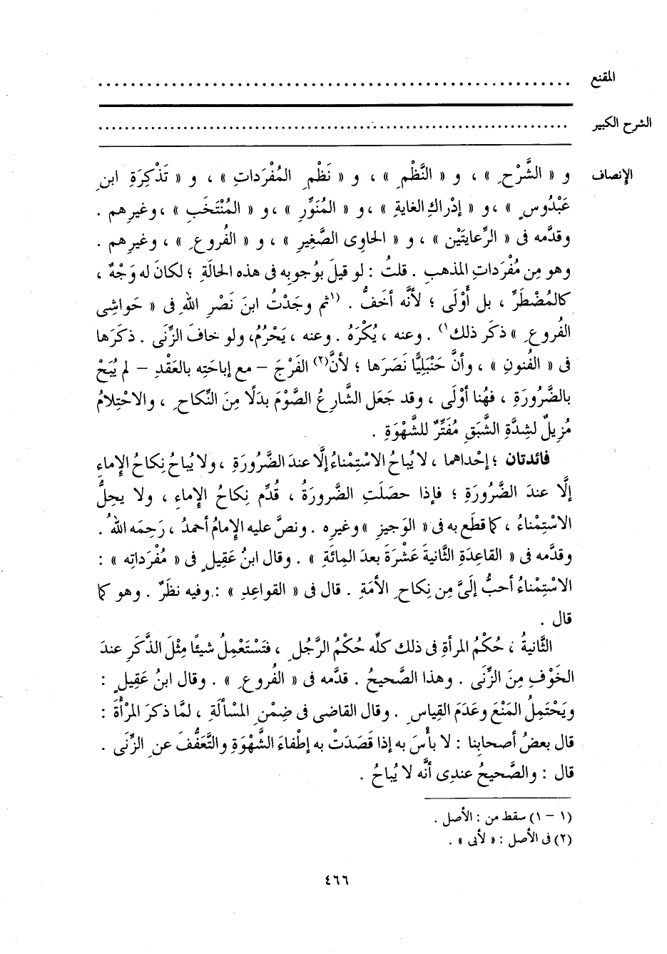 فائدتان، إحْداهما، لا يُباحُ الاسْتِمْناءُ إلَّا عندَ الضَّرُورَةِ، ولا يُباحُ نِكاحُ الإِماءِ إلَّا عنْدَ الضَّرُورَةِ، فإذا حصَلَتِ الضَّرورَةُ، قُدِّم نِكاحُ الإِماءِ، ولا يحِلَّ الاسْتِمْناءُ، كما قطَع به فى «الوَجيزِ» وغيرِه. ونصَّ عليه الإِمامُ أحمدُ، رَحِمَه اللَّهُ. وقدَّمه فى «القاعِدَةِ الثَّانيةَ عَشْرَةَ بعدَ المِائَةِ». وقال ابن عَقِيلٍ فى «مُفْرَداتِه»: الاسْتِمْناءُ أحبُّ إلَىَّ مِن نِكاحِ الأمَةِ. قال فى «القواعِدِ»: وفيه نظَرٌ. وهو كما قال.