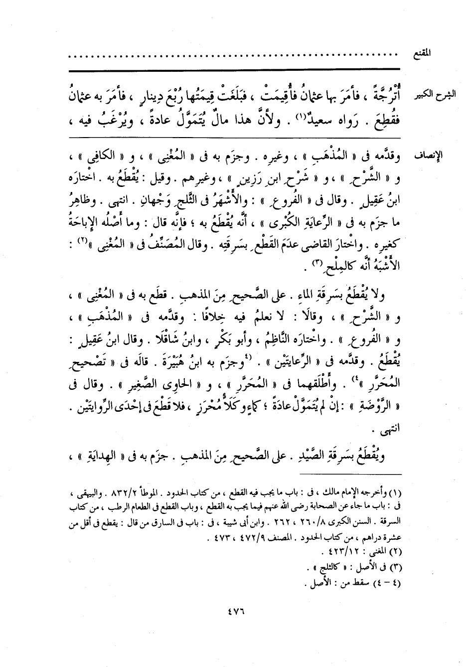 وقدَّمه فى «المُذْهَبِ»، وغيرِه. وجزَم به فى «المُغْنِى»، و «الكافِى»، و «الشَّرْحِ»، و «شَرْحِ ابنِ رَزِينٍ»، وغيرِهم. وقيل: يُقْطَعُ به. اخْتارَه ابنُ عَقِيلٍ. وقال فى «الفُروعِ»: والأشْهَرُ فى الثَّلجِ وَجْهانِ. انتهى. وظاهِرُ ما جزَم به فى «الرِّعايَةِ الكُبْرى»، أنَّه يُقْطَعُ به؛ فإنَّه قال: وما أصْلُه الإِباحَةُ كغيرِه. واخْتارَ القاضى عدَمَ القَطْعِ بسَرِقَتِه. وقال المُصَنِّفُ فى «المُغْنِى» (¬1): الأَشْبَهُ أنَّه كالمِلْحِ (¬2).