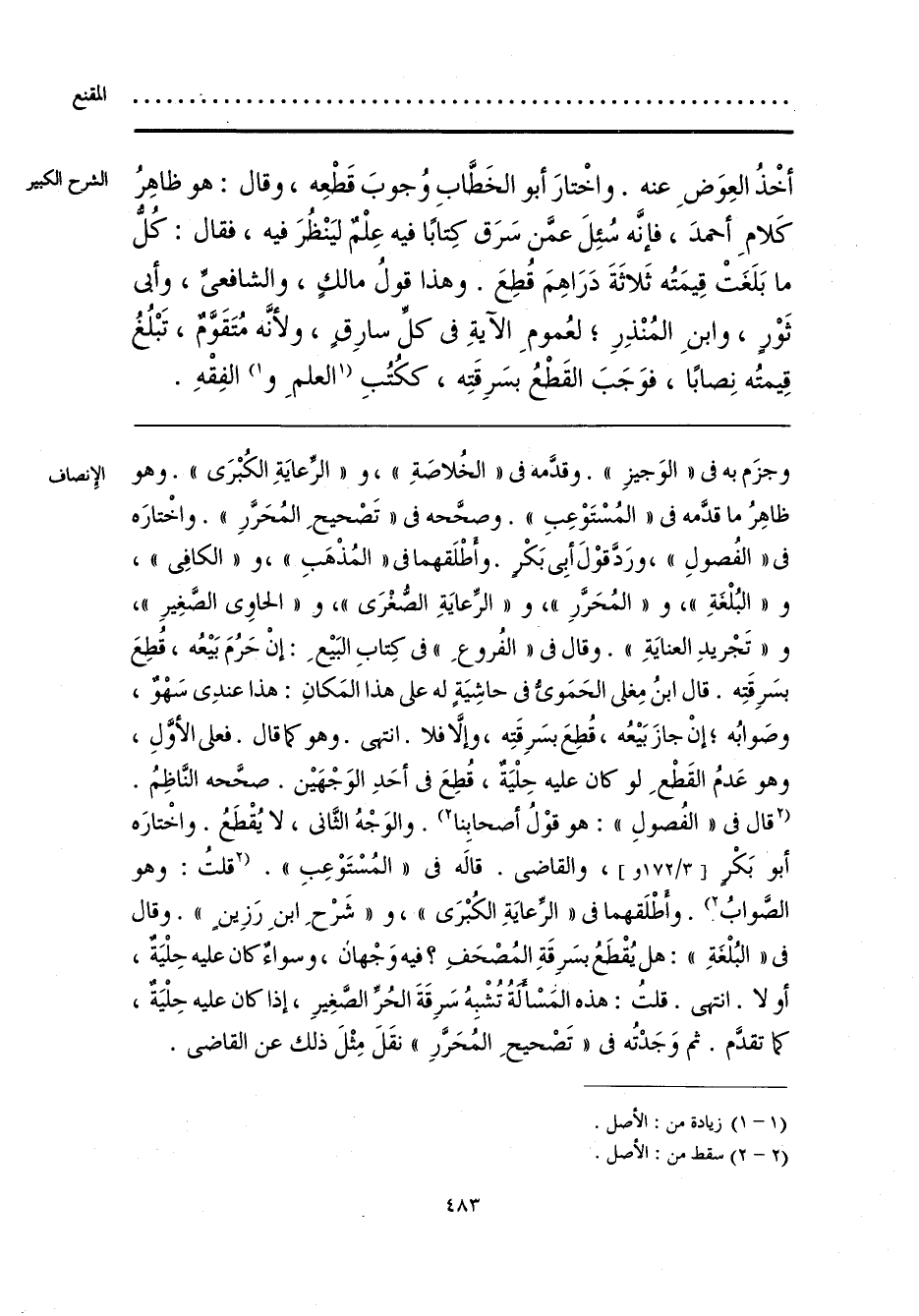 وجزَم به فى «الوَجيزِ». وقدَّمه فى «الخُلاصَةِ»، و «الرِّعايَةِ الكُبْرَى». وهو ظاهِرُ ما قدَّمه فى «المُسْتَوْعِبِ». وصحَّحه فى «تَصْحيحِ المُحَرَّرِ». واخْتارَه فى «الفُصولِ»، ورَدَّ قوْلَ أبِى بَكْرٍ. وأطْلَقهما فى «المُذْهَبِ»، و «الكافِى»، و «البُلْغَةِ»، و «المُحَرَّرِ»، و «الرِّعايَةِ الصُّغْرَى»، و «الحاوِى الصَّغِيرِ»، و «تَجْريدِ العنايَةِ». وقال فى «الفُروعِ» فى كِتابِ البَيْعِ: إنْ حَرُمَ بَيْعُه، قُطِعَ بسَرِقَتِه. قال ابنُ مِغلى الحَمَوىُّ فى حاشِيَةٍ له على هذا المَكانِ: هذا عندِى سَهْوٌ، وصَوابُه؛ إنْ جازَ بَيْعُه، قُطِعَ بسَرِقَتِه، وإلَّا فلا. انتهى. وهو كما قال. فعلى الأَوَّلِ، وهو عَدمُ القَطْعِ لو كان عليه حِلْيَةٌ، قُطِعَ فى أحَدِ الوَجْهَيْن. صحَّحه النَّاظِمُ. [قال فى «الفُصولِ»: هو قوْلُ أصحابِنا] (2). والوَجْهُ الثَّانى، لا يُقْطَعُ. واخْتارَه أبو بَكْرٍ، والقاضى. قالَه فى «المُسْتَوْعِبِ». [قلتُ: وهو الصَّوابُ] (¬1). وأطْلَقهما فى «الرِّعايَةِ الكُبْرَى»، و «شَرْحِ ابنِ رَزِينٍ». وقال فى «البُلْغَةِ»: هل يُقْطَعُ بسَرِقَةِ المُصْحَفِ؟ فيه وَجْهانِ، وسواءٌ كان عليه حِلْيَةٌ، أو لا. انتهى. قلتُ: هذه المَسْأَلَةُ تُشْبِهُ سَرِقَةَ الحُرِّ الصَّغِيرِ، إذا كان عليه حِلْيَةٌ، كما تقدَّم. ثم وَجَدْتُه فى «تَصْحيحِ المُحَرَّرِ» نقَلَ مِثْلَ ذلك عن القاضى.