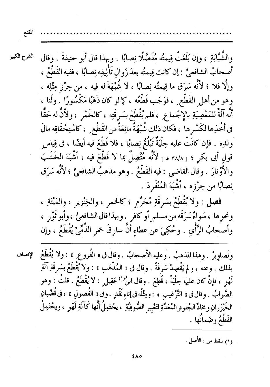 وتَصاوِيرُ. وهذا المذهبُ. وعليه الأصحابُ. وقال فى «الفُروعِ»: ولا يُقْطَعُ بذلك. وعنه، ولم يَقْصِدْ سَرِقَة. وقال فى «المُذْهَبِ»: ولا يُقْطَعُ بسَرِقَةِ آلةِ لَهْوٍ، فإنْ كان عليها حِلْيَةٌ، قُطِعَ. وقال ابنُ (¬1) عَقِيلٍ: لا يُقْطَعُ. قلتُ: وهو الصَّوابُ. وقال فى «التَّرْغيبِ»: ومِثْلُه فى إناءِ نَقْدٍ. وفى «الفُصولِ»، فى قُضْبانِ الخَيْزَرانِ ومخادِّ الجُلودِ المُعَاةِ لتَغْبِيرِ الصُّوفِيَّةِ، يحْتَمِلُ أنَّها كآلَةِ لَهْوٍ، ويحْتَمِلُ القَطْعُ وضَمانُها.