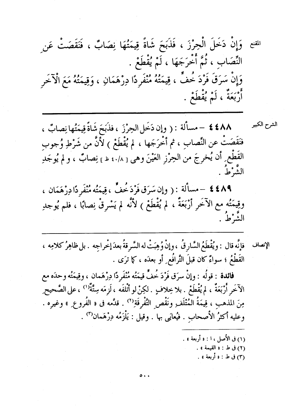 فائدة: قولُه: وإنْ سرَق فَرْدَ خُفٍّ قيمَتُه مُنْفَرِدًا دِرْهَمان، وقِيمَتُه وحدَه مع الآخَرِ أَرْبَعَةٌ، لم يُقْطَعْ. بلا خِلافٍ. لكِنْ لو أتْلفَه، لَزِمَه سِتَّةٌ (¬1)، على الصَّحيحِ مِنَ المذهب، قِيمَةُ المُتْلَفِ ونَقْصِ التَّفْرِقَةِ (¬2). قدَّمه فى «الفُروعِ» وغيرِه. وعليه أكثرُ الأصحابِ. فيُعايَى بها. وقيل: يَلْزَمُه دِرْهَمان (¬3).