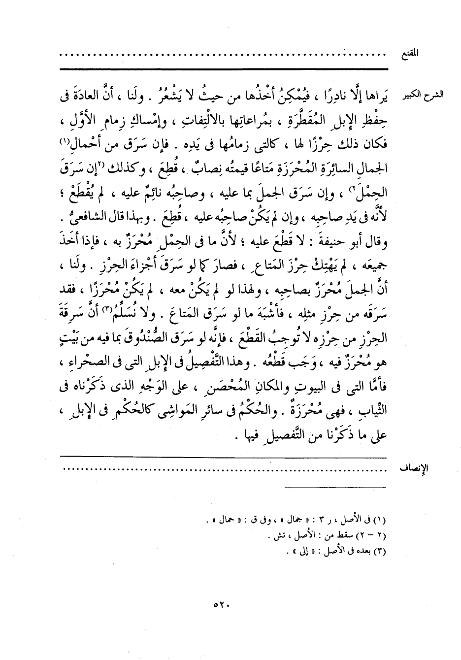 يَراها إلَّا نادِرًا، فيُمْكِنُ أخْذُها من حيثُ لا يَشْعُرُ. ولَنا، أنَّ العادَةَ في حِفْظِ الإِبلِ المُقَطَّرَةِ، بمُراعاتِها بالالْتِفاتِ، وإمْساكِ زِمام الأَوَّلِ، فكان ذلك حِرْزًا لها، كالتى زمامُها في يَدِه. فإن سَرَق من أَحْمالِ (¬1) الجمالِ السائِرَةِ المُحْرَزَةِ مَتاعًا قيمتُه نِصابٌ، قُطِعَ، وكذلك [إن سَرَقَ الحِمْلَ] (¬2)، وإن سَرَق الجملَ بما عليه، وصاحِبُه نائِمٌ عليه، لم يُقْطَعْ؛ لأنَّه في يَدِ صاحِبِه، وإن لم يَكُنْ صاحِبُه عليه، قُطِعَ. وبهذا قال الشافعىُّ. وقال أبو حنيفةَ: لا قَطْعَ عليه، لأَنَّ ما في الحِمْلِ مُحْرَزٌ به، فإذا أخَذَ جميعَه، لم يَهْتِكْ حِرْزَ المَتاعِ، فصارَ كما لو سَرَقَ أجْزاءَ الحِرْزِ. ولَنا، أنَّ الجملَ مُحْرَزٌ بصاحِبِه، ولهذا لو لم يَكُنْ معه، لم يَكُنْ مُحْرَزًا، فقد سَرَقَه من حِرْزِ مثلِه، فأشْبَهَ ما لو سَرَق المَتاعَ. ولا نُسَلِّمُ (¬3) أنَّ سَرِقَةَ الحِرْزِ من حِرْزِه لا تُوجِبُ القَطْعَ، فإنَّه لو سَرَق الصُّنْدُوقَ بما فيه من بَيْتٍ هو مُحْرَزٌ فيه، وَجَب قَطْعُه. وهذا التَّفْصِيلُ في الإِبلِ التى في الصحْراءِ، فأمَّا التى في البيوتِ والمكانِ المُحْصَنِ، على الوَجْهِ الذى ذَكَرْناه في الثِّيابِ، فهى مُحْرَزَةٌ. والحُكْمُ في سائرِ المَواشِى كالحُكْمِ في الإِبلِ، على ما ذَكَرْنا من التَّفصيلِ فيها.