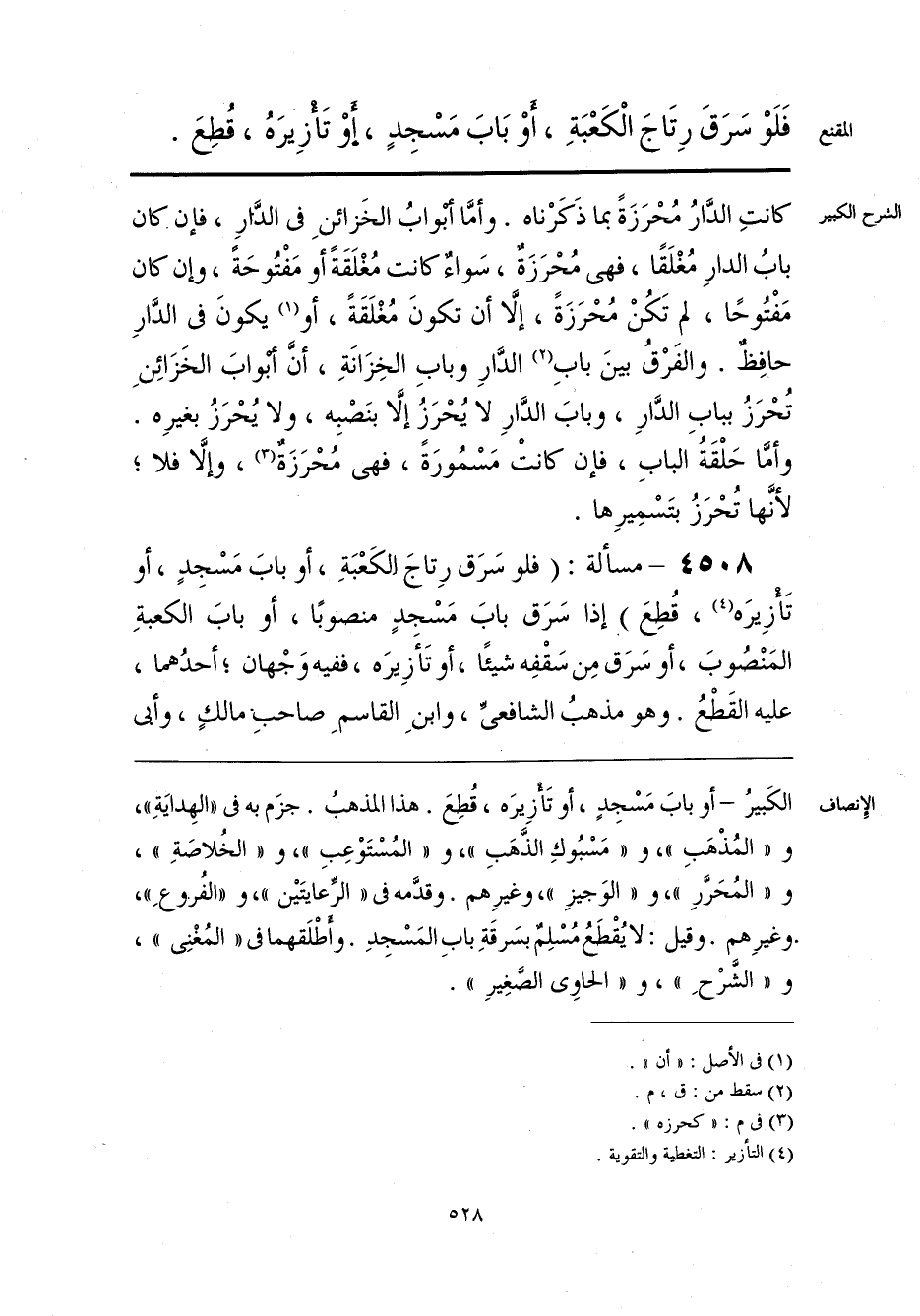 الكَبيرُ- أو بابَ مَسْجِدٍ، أو تَأْزِيرَه، قُطِعَ. هذا المذهبُ. جزَم به فى «الهِدايَةِ»، و «المُذْهَبِ»، و «مَسْبُوكِ الذَّهَبِ»، و «المُسْتَوْعِبِ»، و «الخُلاصَةِ»، و «المُحَرَّرِ»، و «الوَجيزِ»، وغيرِهم. وقدَّمه فى «الرِّعايتَيْن»، و «الفُروعِ»، وغيرِهم. وقيل: لا يُقْطَعُ مُسْلِمٌ بسَرقَةِ بابِ المَسْجِدِ. وأَطْلَقهما فى «المُغْنِى»، و «الشَّرْحِ»، و «الحاوِى الصَّغِيرِ».