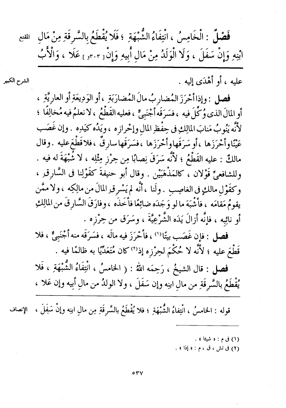 فَصْلٌ: الْخَامِسُ، انْتِفَاءُ الشُّبْهَةِ؛ فَلَا يُقْطَعُ بِالسَّرِقَةِ مِنْ مَالِ ابْنِهِ وَإِنْ سَفَلَ، وَلَا الْوَلَدُ مِنْ مَالِ أَبِيهِ وَإِنْ عَلَا، وَالْأَبُ