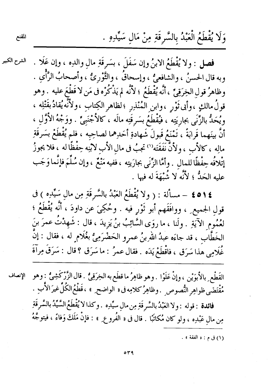 فائدة: قوله: ولا العَبْدُ بالسَّرِقَةِ مِن مالِ سيِّدِه. وكذا لا يُقْطَعُ السَّيِّدُ بالسَّرِقَةِ مِن مالِ عَبْدِه، ولو كان مُكاتَبًا. قال فى «الفُروعِ»: فإنْ مَلَكَ وَفاءً، فيتوجَّهُ