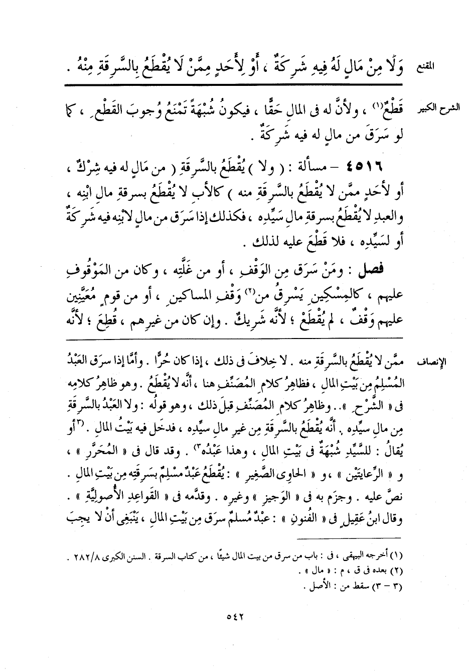 ممَّن لا يُقْطَعُ بالسَّرِقَةِ منه. لا خِلافَ فى ذلك، إذا كان حُرًّا. وأمَّا إذا سرَق العَبْدُ المُسْلِمُ من بَيْتِ المالِ، فظاهِرُ كلامِ المُصَنِّفِ هنا، أنَّه لا يُقْطَعُ. وهو ظاهِرُ كلامِه فى «الشَّرْحِ». وظاهِرُ كلامِ المُصَنِّفِ قبلَ ذلك، وهو قولُه: ولا العَبْدُ بالسَّرِقَةِ مِن مالِ سيِّدِه. أنَّه يُقْطَعُ بالسَّرِقَةِ مِن غيرِ مالِ سيِّدِه، فدخَل فيه بَيْتُ المالِ. [أو يُقالُ: للسَّيِّدِ شُبْهَةٌ فى بَيْتِ المالِ، وهذا عَبْدُه] (¬1). وقد قال فى «المُحَرَّرِ»، و «الرِّعايتَيْن»، و «الحاوِى الصَّغِيرِ»: يُقْطَعُ عَبْدٌ مسْلِمٌ بسَرِقَتِه مِن بَيْتِ المالِ. نصَّ عليه. وجزَم به فى «الوَجيزِ» وغيرِه. وقدَّمه فى «القَواعِدِ الأُصولِيَّةِ». وقال ابنُ عَقِيلٍ فى «الفُنونِ»: عبْدٌ مُسلمٌ سرَق مِن بَيْتِ المالِ، يَنْبَغِى أَنْ لا يجِبَ