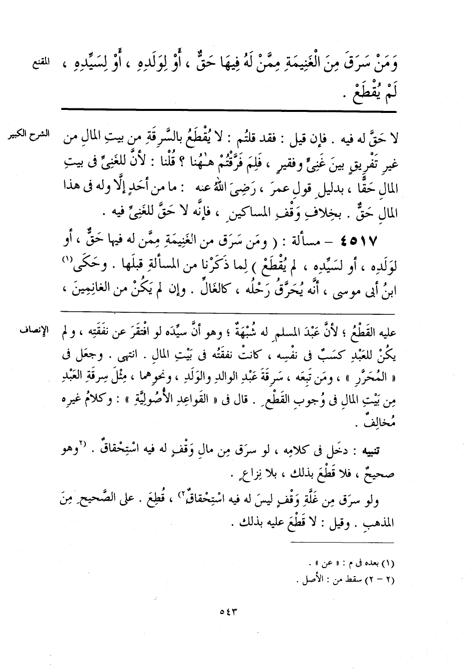 وَمَنْ سَرَقَ مِنَ الْغَنِيمَةِ مِمَّنْ لَهُ فِيهَا حَقٌّ، أَو لِوَلَدِهِ، أَوْ لِسَيِّدِهِ، لَمْ يُقْطَعْ.