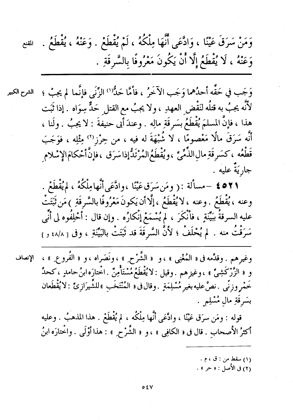 وَمَنْ سَرَقَ عَيْنًا، وَادَّعَى أَنَّهَا مِلْكُهُ، لَمْ يُقْطَعْ. وَعَنْهُ، يُقْطَعُ. وَعَنْهُ، لَا يُقْطَعُ إِلَّا أَنْ يَكُونَ مَعْرُوفًا بِالسَّرِقَةِ.