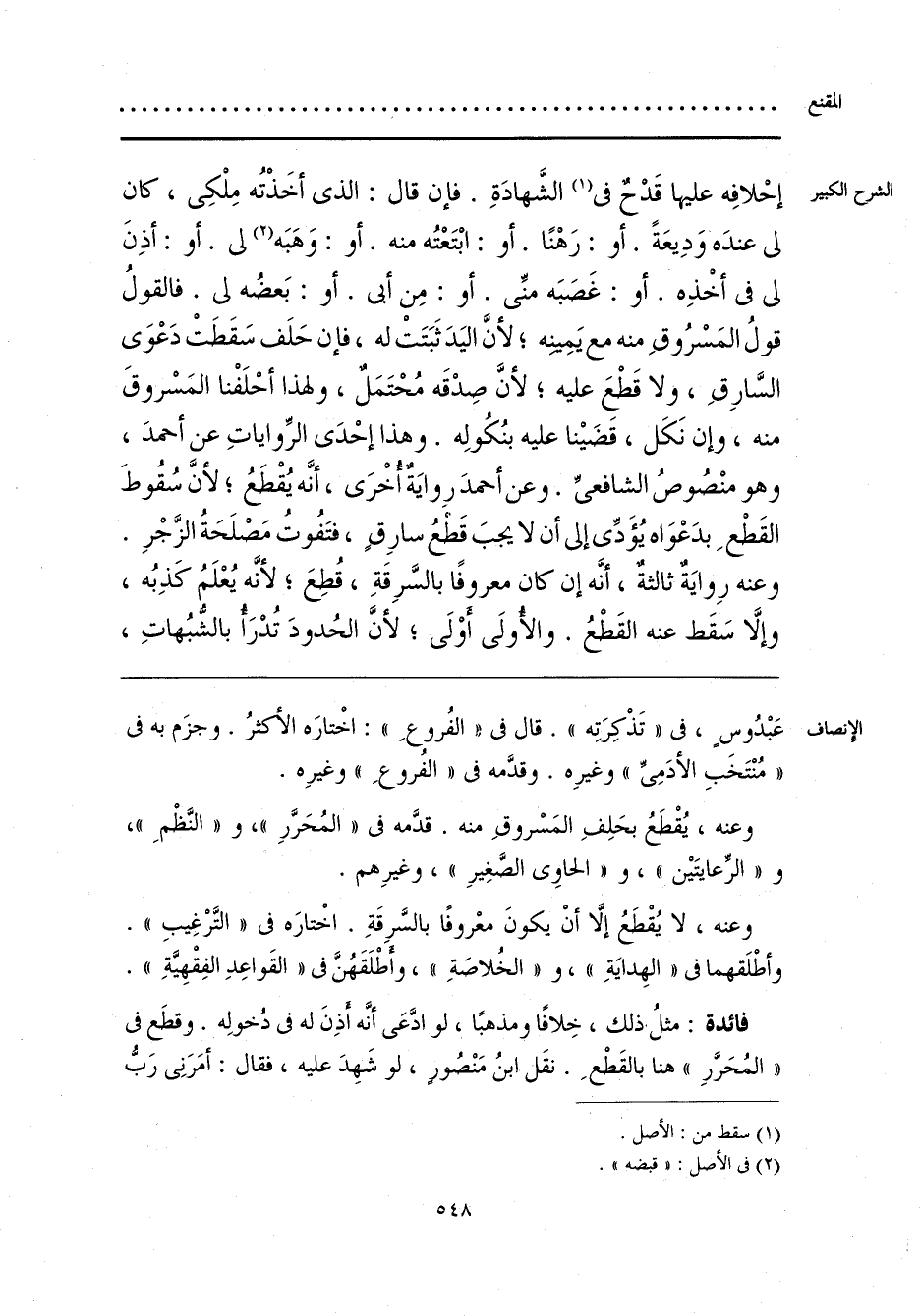 وعنه، يُقْطَعُ بحَلِفِ المَسْروقِ منه. قدَّمه فى «المُحَرَّرِ»، و «النَّظْمِ»، و «الرِّعايتَيْن»، و «الحاوِى الصَّغِيرِ»، وغيرِهم.