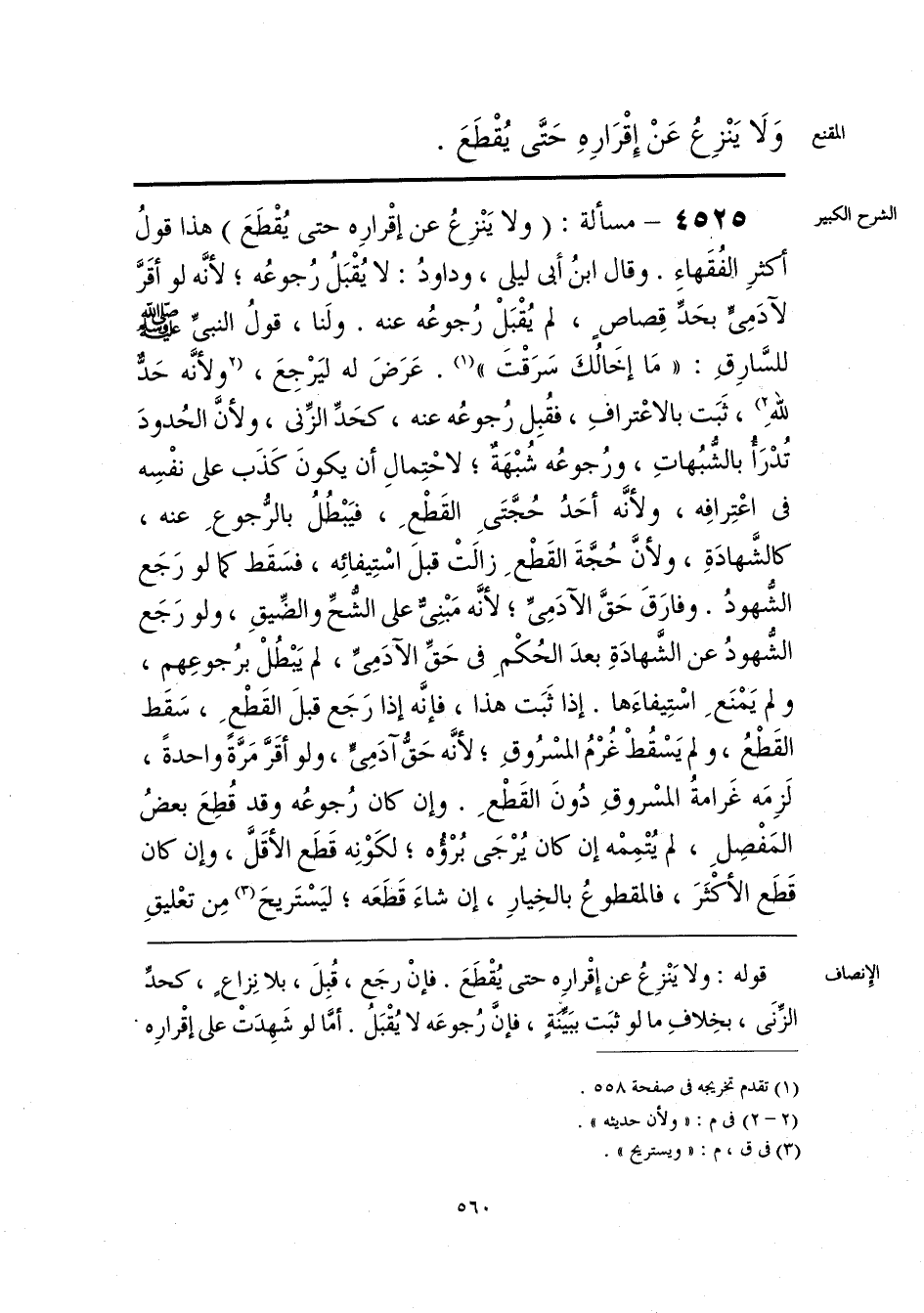 قوله: ولا يَنْزِعُ عن إِقْرارِه حتى يُقْطَعَ. فإنْ رجَع، قُبِلَ، بلا نِزاعٍ، كحدِّ الزِّنَى، بخِلافِ ما لو ثبَت ببَيِّنَةٍ، فإنَّ رُجوعَه لا يُقْبَل. أمَّا لو شَهِدَت على إقْرارِه