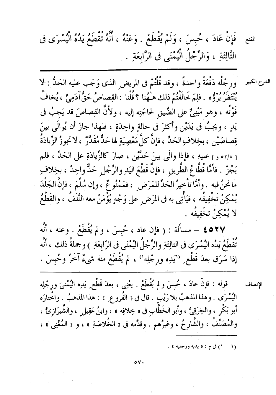 قوله: فإنْ عادَ، حُبِسَ ولم يُقْطَعْ. يعْنِى، بعدَ قَطْعِ يَدِه اليُمْنىَ ورِجْلِه اليُسْرَى. وهذا المذهبُ بلا رَيْبٍ. قال فى «الفُروعِ»: هذا المذهبُ. واخْتارَه أبو بَكْرٍ، والخِرَقِىُّ، وأبو الخَطَّابِ فى «خِلافِه»، وابنُ عَقِيلٍ، والشِّيرَازِىُّ، والمُصَنِّفُ، والشَّارِحُ، وغيرُهم. وقدَّمه فى «الخُلاصَةِ»، و «المُغنِى»،