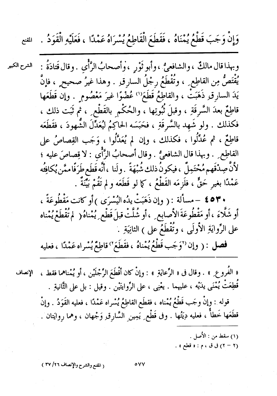 «الفُروعِ». وقال فى «الرِّعايَةِ»: وإنْ كان أقْطَعَ الرِّجْلَيْن، أو يُمْناهما فقط، قُطِعَتْ يُمْنَى يدَيْه، عليهما. يعْنِى، على الرِّوايتَيْن. وقيل: بل على الثَّانيةِ.