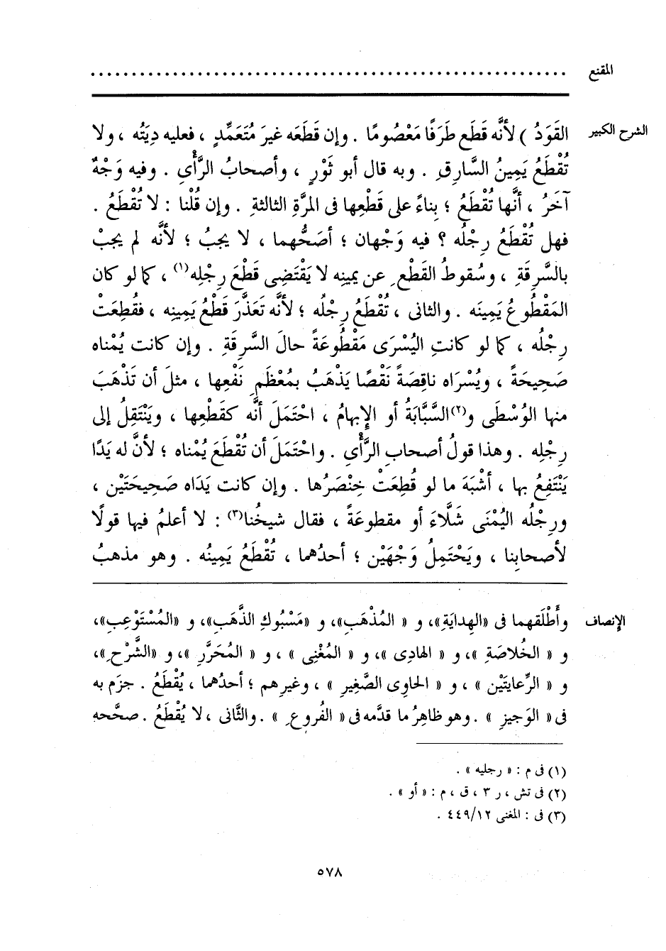 وأطلَقهما فى «الهِدايَةِ»، و «المُذْهَبِ»، و «مَسْبُوكِ الذَّهَبِ»، و «المُسْتَوْعِبِ»، و «الخُلاصَةِ»، و «الهادِى»، و «المُغْنِى»، و «المُحَرَّرِ»، و «الشَّرْحِ»، و «الرِّعايتَيْن»، و «الحاوِى الصَّغِيرِ»، وغيرِهم؛ أحدُهما، يُقْطَعُ. جزَم به فى «الوَجيزِ». وهو ظاهِرُ ما قدَّمه فى «الفُروعِ». والثَّانى، لا يُقْطَعُ. صحَّحه