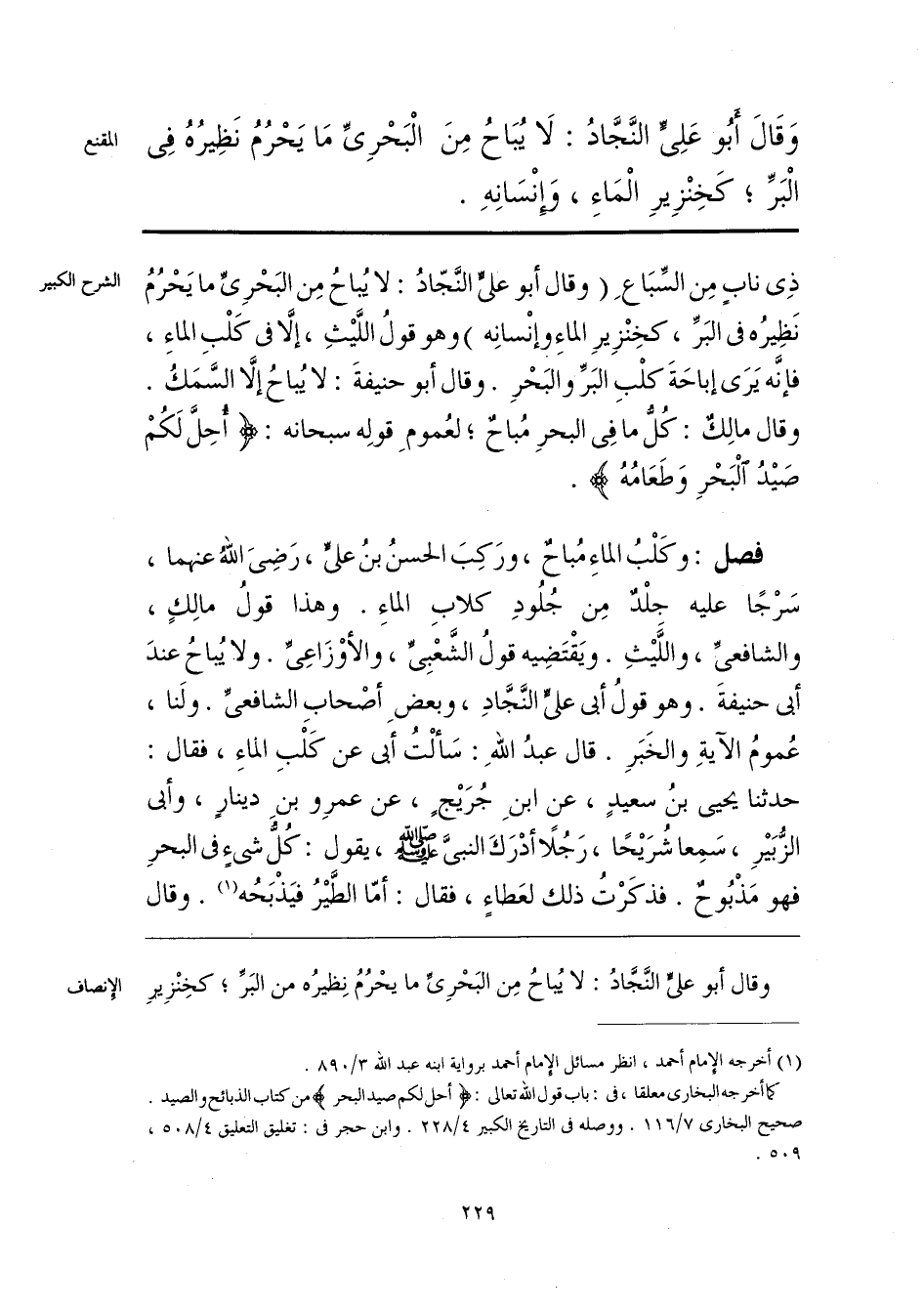 وقال أبو عليٍّ النَّجَادُ: لا يُباحُ مِن البَحْرِيِّ ما يحْرُمُ نِظيرُه من البَرِّ؛ كخِنْزِيرِ
