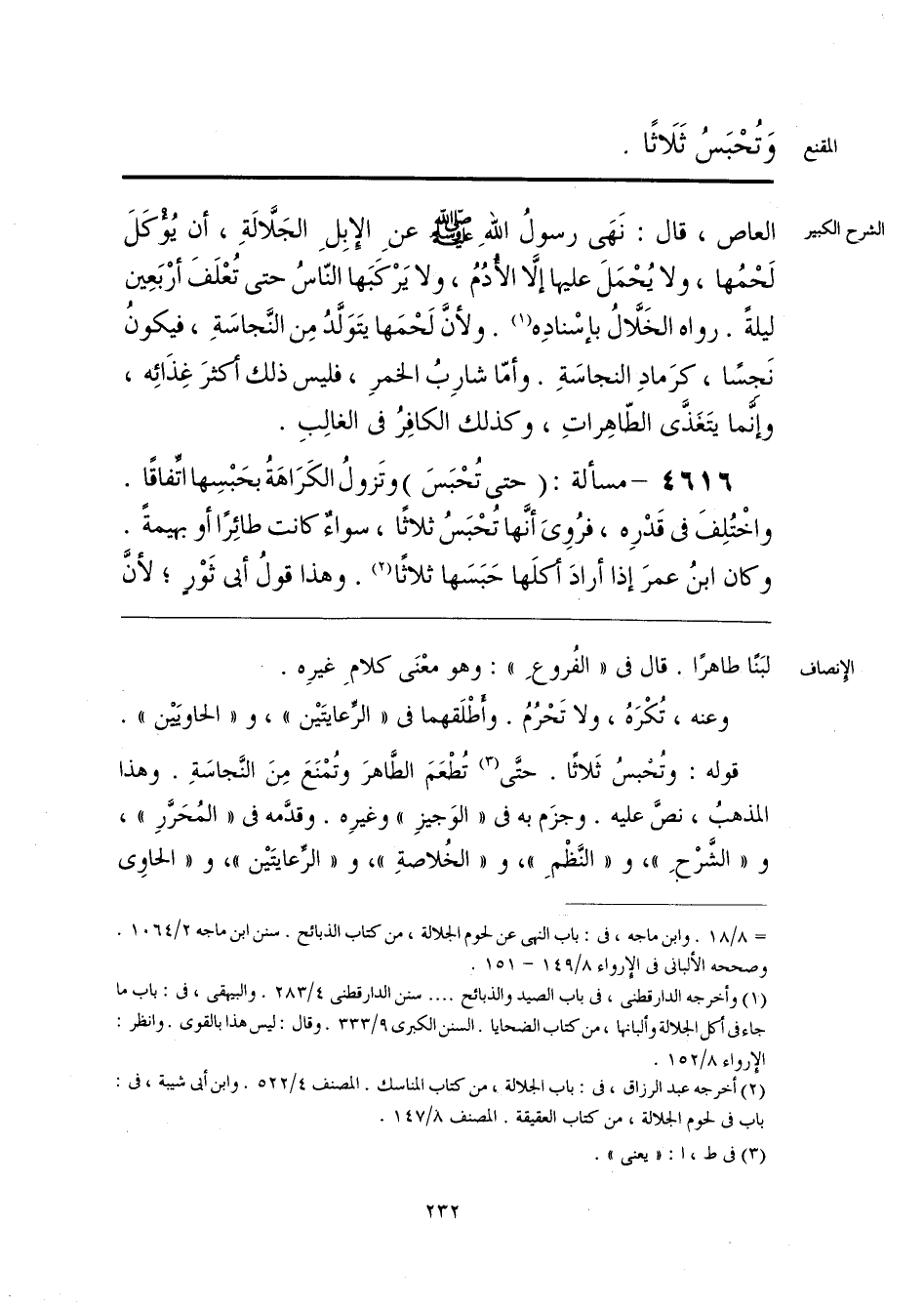قوله: وتُحْبسُ ثَلاثًا. حتَّى (¬1) تُطْعَمَ الطَّاهرَ وتُمْنَعَ مِنَ النَّجاسَةِ. وهذا المذهبُ، نصَّ عليه. وجزَم به في «الوَجيزِ» وغيرِه. وقدَّمه في «المُحَرَّرِ»، و «الشَّرْحِ»، و «النَّظْمِ»، و «الخُلاصةِ»، و «الرِّعايتَين»، و «الحاوي