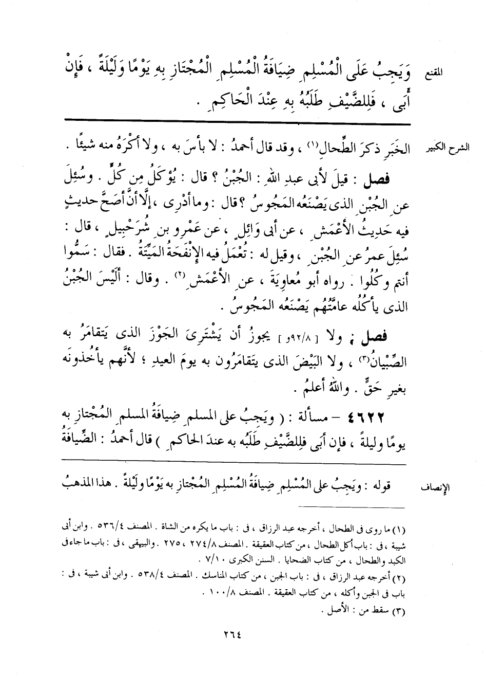 وَيَجِبُ عَلَى الْمُسْلِمِ ضِيَافَةُ الْمُسْلِمِ الْمُجْتَازِ بِهِ يَوْمًا وَلَيلَةً، فَإِنْ أَبَى، فَلِلضَّيفِ طَلَبُهُ بِهِ عِنْدَ الْحَاكِمِ.