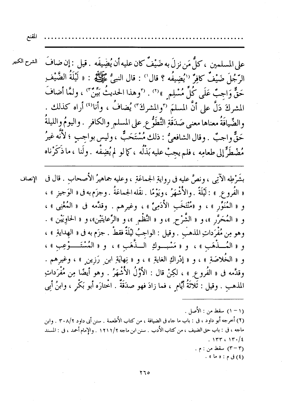بشَرْطِه الآتِي، ونصَّ عليه في رِوايةِ الجماعَةِ، وعليه جماهيرُ الأصحابِ. قال في «الفُروعِ»: لَيلَةً. والأَشْهَرُ، ويَوْمًا. نقَله الجماعَةُ. وجزَم به في «الوَجيزِ»، و «المُنَوِّرِ»، و «مُنْتَخَبِ الأدَمِيِّ»، وغيرِهم. وقدَّمه في «المُغْنِي»، و «المُحَرَّرِ»، و «الشَّرْحِ»، و «النَّظْمِ»، و «الرِّعايتَين»، و «الحاويَيْن». وهو مِن مُفْرَداتِ المذهبِ. وقيل: الواجِبُ ليلَةٌ فقطْ. جزَم به في «الهِدايةِ»، و «المُذْهَبِ»، و «مَسْبوكِ الذَّهَبِ»، و «المُسْتَوْعِبِ»، و «الخُلاصَةِ»، و «إدْراكِ الغايةِ»، و «نِهايَةِ ابنِ رَزِينٍ»، وغيرِهم. وقدَّمه في «الفُروعِ»، لكِنْ قال: الأوَّلُ الأَشْهَرُ. وهو أيضًا مِن مُفْرَداتِ المذهبِ. وقيل: ثَلاثةُ أيَّامٍ، فما زادَ فهو صدَقَةٌ. اخْتارَه أبو بَكْرٍ، وابنُ أبِي
