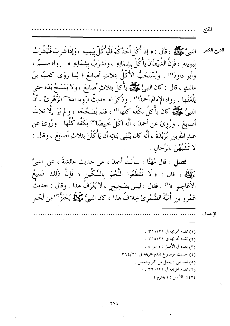 النبيِّ - صلى الله عليه وسلم -، قال: «إذَا أَكَلَ أحَدُكُمْ فَلْيَأكُلْ بِيَمِينِه، وَإذَا شَرِبَ فَلْيَشْرَبْ بِيَمِينِهِ، فَإنَّ الشَّيطَانَ يَأْكُلُ بِشِمَالِهِ، ويَشْرَبُ بِشِمَالِهِ». رواه مسلمٌ، وأبو داودَ (¬1). ويُسْتَحَبُّ الأكْلُ بثلاثِ أصابعَ، لِما روَى كعبُ بنُ مالكٍ، قال: كان النبيُّ - صلى الله عليه وسلم - يأْكلُ بثلاثِ أصابعَ، ولا يَمْسَحُ يَدَه حتى يَلْعَقَها. رواه الإِمامُ أحمدُ (¬2). وذُكِرَ له حديثٌ ترْويه ابنة (¬3) الزُّهْرِيِّ، أنَّ النبيَّ - صلى الله عليه وسلم - كان يأْكلُ بكَفِّه كلِّها (¬4)، فلم يُصحِّحْه، ولم يَرَ إلَّا ثلاثَ أصابِعَ. ورُوِيَ عن أحمدَ، أنَّه أكَلَ خَبيصًا (¬5) بكَفِّه كُلِّها. ورُوِيَ عن عبدِ اللهِ بنِ بُرَيدَةَ، أنَّه كان يَنْهَى بَناتِه أنَّ يَأْكُلْنَ بثلاثِ أصابعَ، وقال: لا تَشَبَّهْنَ بالرِّجالِ.