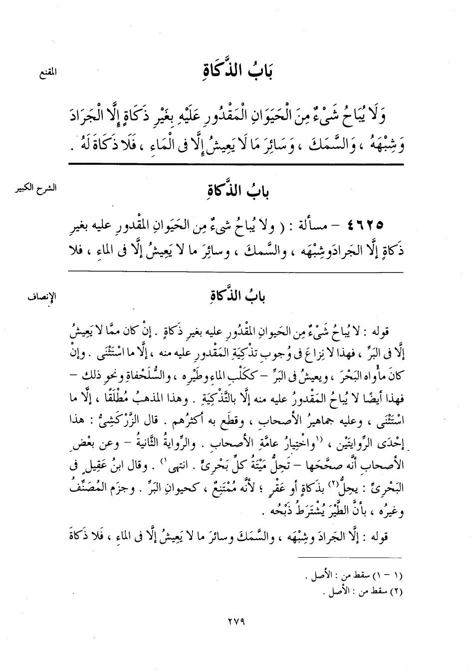 وَلَا يُبَاحُ شَيْءٌ مِنَ الْحَيَوَانِ الْمَقْدُورِ عَلَيهِ بِغَيرِ ذَكَاةٍ إلا الْجَرَادَ وَشِبْهَهُ، وَالسَّمَكَ، وَسَائِرَ مَا لَا يَعِيشُ إلا في الْمَاءِ، فَلَا ذَكَاةَ لَهُ.