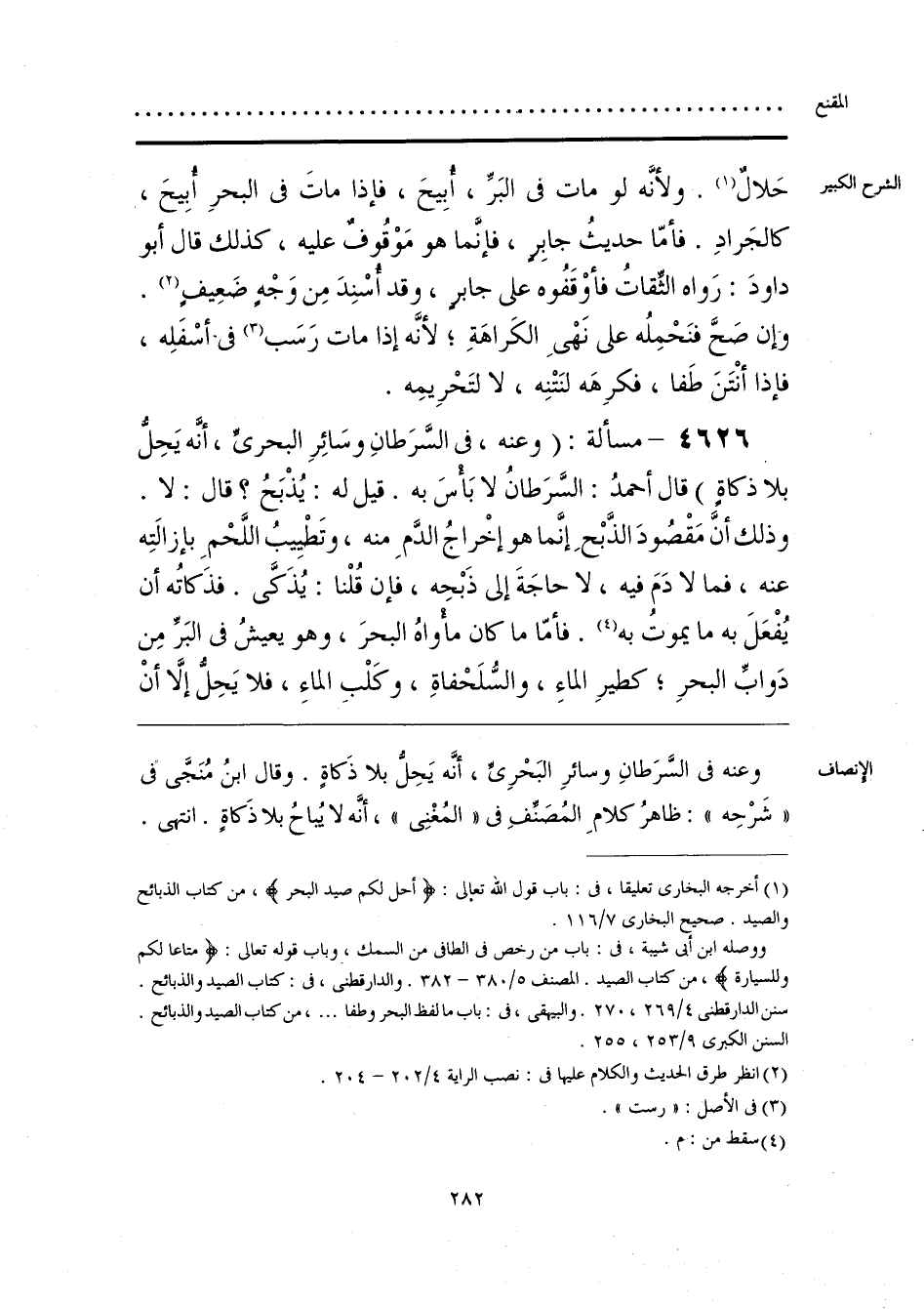 وعنه في السَّرَطانِ وسائرِ البَحْرِيِّ، أنَّه يَحِل بلا ذَكاةٍ. وقال ابنُ مُنَجَّى في «شَرْحِه»: ظاهرُ كلامِ المُصَنفِ في «المُغْنِي»، أنَّه لا يُباحُ بلا ذَكاةٍ. انتهى.