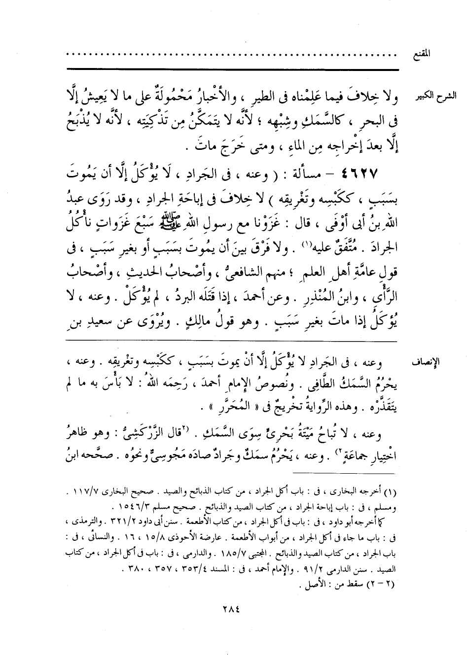 وعنه، في الجَرادِ لا يُؤْكَلُ إلَّا أنْ يموتَ بسَبَبٍ، ككَبْسِه وتغْريقِه. وعنه، يحْرُمُ السَّمَكُ الطَّافِي. ونُصوصُ الإِمامِ أحمدَ، رَحِمَه اللهُ: لا بَأْسَ به ما لم يتَقَذَّرْه. وهذه الروايةُ تخريجٌ في «المُحَرَّرِ».