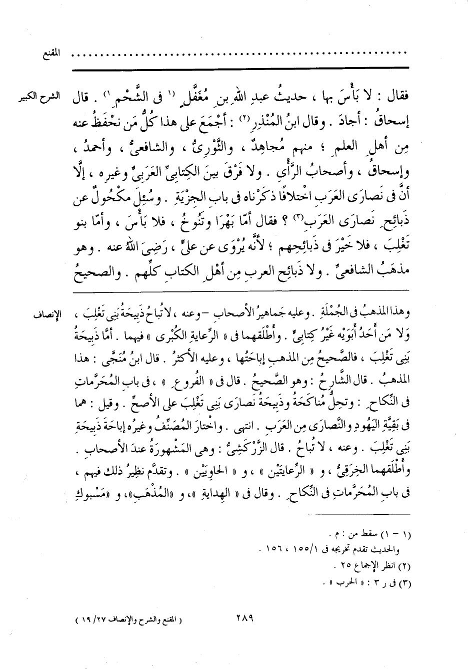 وهذا المذهبُ في الجُمْلَةِ. وعليه جَماهيرُ الأصحابِ- وعنه، لا تُباحُ ذَبِيحَةُ بَنِي تَغْلِبَ، وَلا مَن أحَدُ أبَوَيه غَيرُ كِتابِيٍّ. وأطْلَقهما في «الرِّعايةِ الكُبْرى» فيهما. أمَّا ذَبِيحَةُ بَنِي تَغْلِبَ، فالصَّحيحُ مِن المذهبِ إباحَتُها، وعليه الأكثرُ. قال ابنُ مُنَجَّى: هذا المذهبُ. قال الشَّارِحُ: وهو الضَّحيحُ. قال في «الفُروعِ»، في بابِ المُحَرَّماتِ في النِّكاحِ: وتحِل مُناكَحَةُ وذَبِيحَةُ نَصارَى بَنِي تَغْلِبَ على الأصحِّ. وقيل: هما في بَقِيَّةِ اليَهُودِ والنَّصارَى مِن العَرَبِ. انتهى. واخْتارَ المُصَنِّفُ وغيرُه إباحَةَ ذَبِيحَةِ بَنِي تَغْلِبَ. وعنه، لا تُباحُ. قال الزَّرْكَشِي: وهي المَشْهورَةُ عندَ الأصحابِ. وأطْلَقهما الخِرَقِيُّ، و «الرِّعايتَين»، و «الحاويَيْن». وتقدَّم نظِيرُ ذلك فيهم، في بابِ المُحَرَّماتِ في النِّكاحِ. وقال في «الهِدايةِ»، و «المُذْهَبِ»، و «مَسْبوكِ