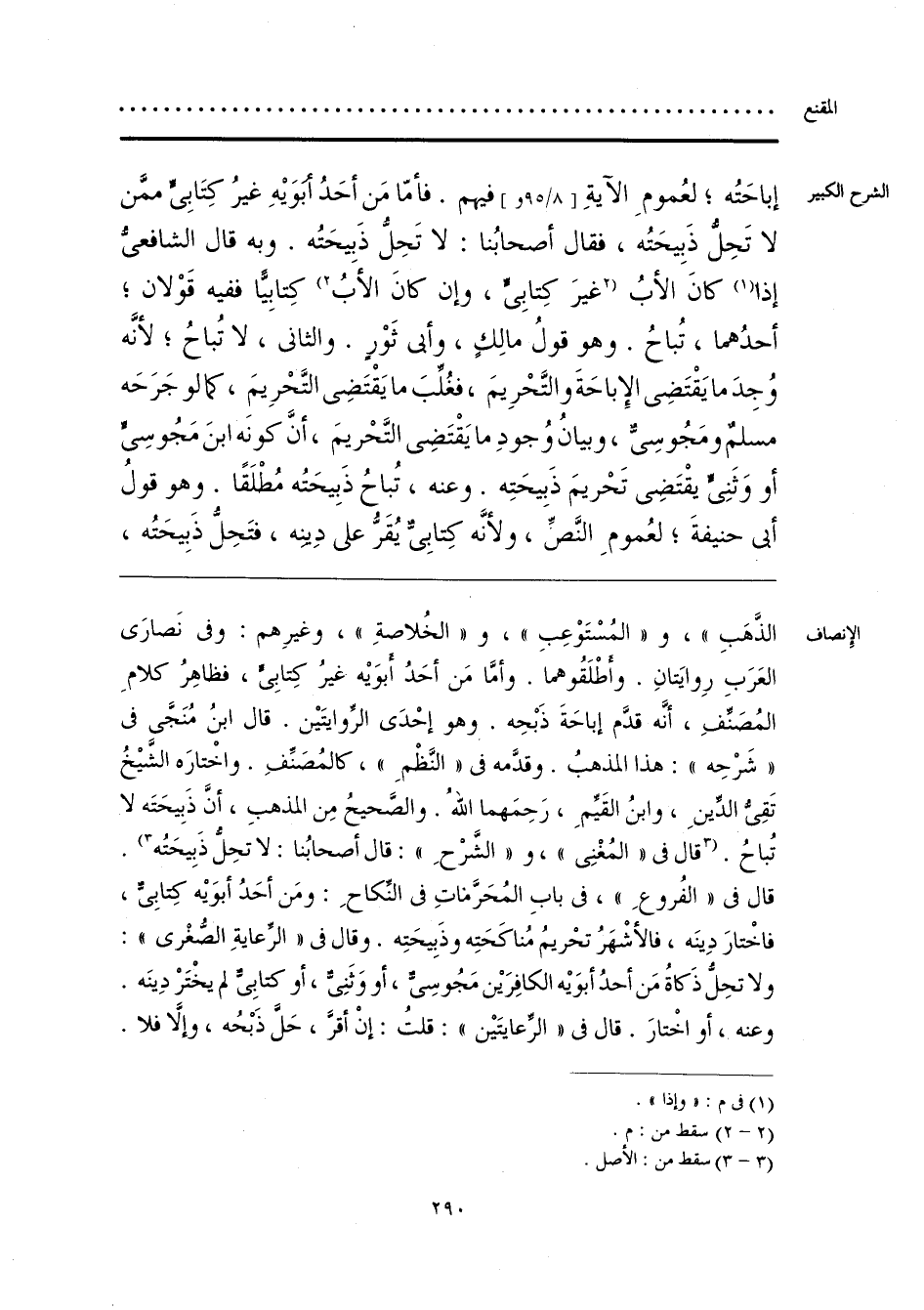 الذَّهَبِ»، و «المُسْتَوْعِبِ»، و «الخُلاصةِ»، وغيرِهم: وفي نَصارَى العَرَبِ رِوايَتانِ. وأطْلَقُوهما. وأمَّا مَن أحَدُ أَبوَيه غيرُ كِتابِيٍّ، فظاهِرُ كلامِ المُصَنفِ، أنَّه قدَّم إباحَةَ ذَبْحِه. وهو إحْدَى الروايات. قال ابنُ مُنَجَّى في «شَرْحِه»: هذا المذهبُ. وقدَّمه في «النَّظْمِ»، كالمُصَنِّفِ. واخْتارَه الشَّيخُ تَقِيُّ الدِّينِ، وابنُ القَيِّمِ، رَحِمَهما اللهُ. والصَّحيحُ مِن المذهبِ، أنَّ ذَبِيحَتَه لا تُباحُ. [قال في «المُغْنِي»، و «الشَّرْحِ»: قال أصحابُنا: لا تحِلُّ ذَبِيحَتُه] (¬1). قال في «الفُروعِ»، في بابِ المُحَرَّماتِ في النِّكاحِ: ومَن أحَدُ أبوَيه كِتابِيٌّ، فاخْتارَ دِينَه، فالأشْهَرُ تحْريمُ مُناكَحَتِه وذَبِيحَتِه. وقال في «الرِّعايةِ الصُّغْرى»: ولا تحِلُّ ذَكاةُ مَن أحدُ أبوَيه الكافِرَين مَجُوسِيٌّ، أو وَثَنِيٌّ، أو كتابِيٌّ لم يخْتَرْ دِينَه. وعنه، أو اخْتارَ. قال في «الرِّعايتَين»: قلتُ: إنْ أقرَّ، حَلَّ ذَبْحُه، وإلَّا فلا.