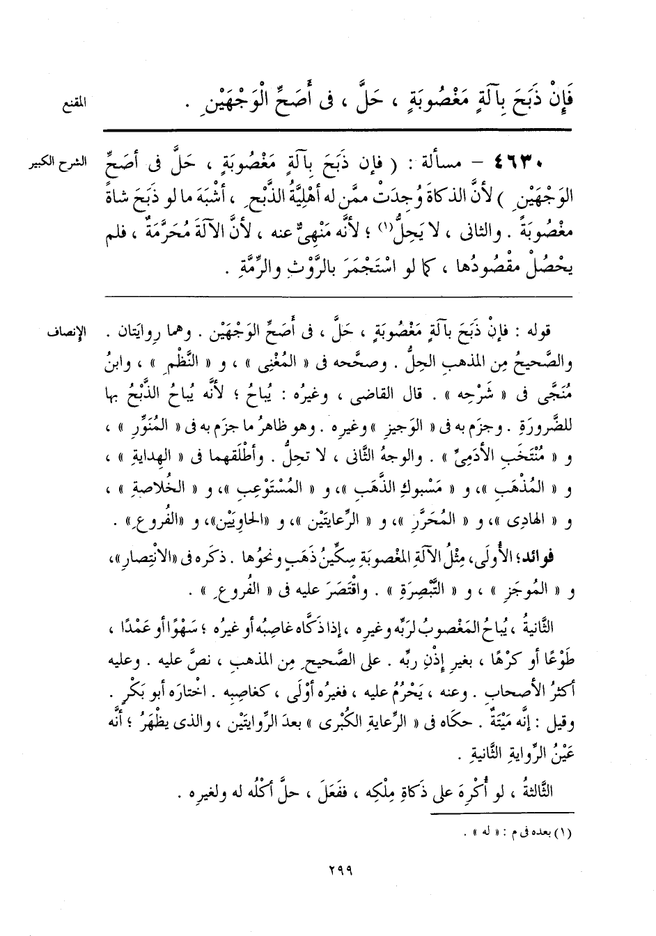 الثَّانيةُ، يُباحُ المَغْصوبُ لرَبِّه وغيرِه، إذا ذَكَّاه غاصِبُه أو غيرُه، سَهْوًا أو عَمْدًا، طَوْعًا أو كرْهًا، بغيرِ إِذْنِ ربِّه. على الصَّحيحِ مِن المذهبِ، نصَّ عليه. وعليه أكثرُ الأصحابِ. وعنه، يَحْرُمُ عليه، فغيرُه أوْلَى، كغاصِبِه. اخْتارَه أبو بَكْرٍ. وقيل: إنَّه مَيتَةٌ. حكَاه في «الرِّعايةِ الكُبْرى» بعدَ الرِّوايتَين، والذي يظْهَرُ، أنَّه عَينُ الرِّوايةِ الثَّانيةِ.