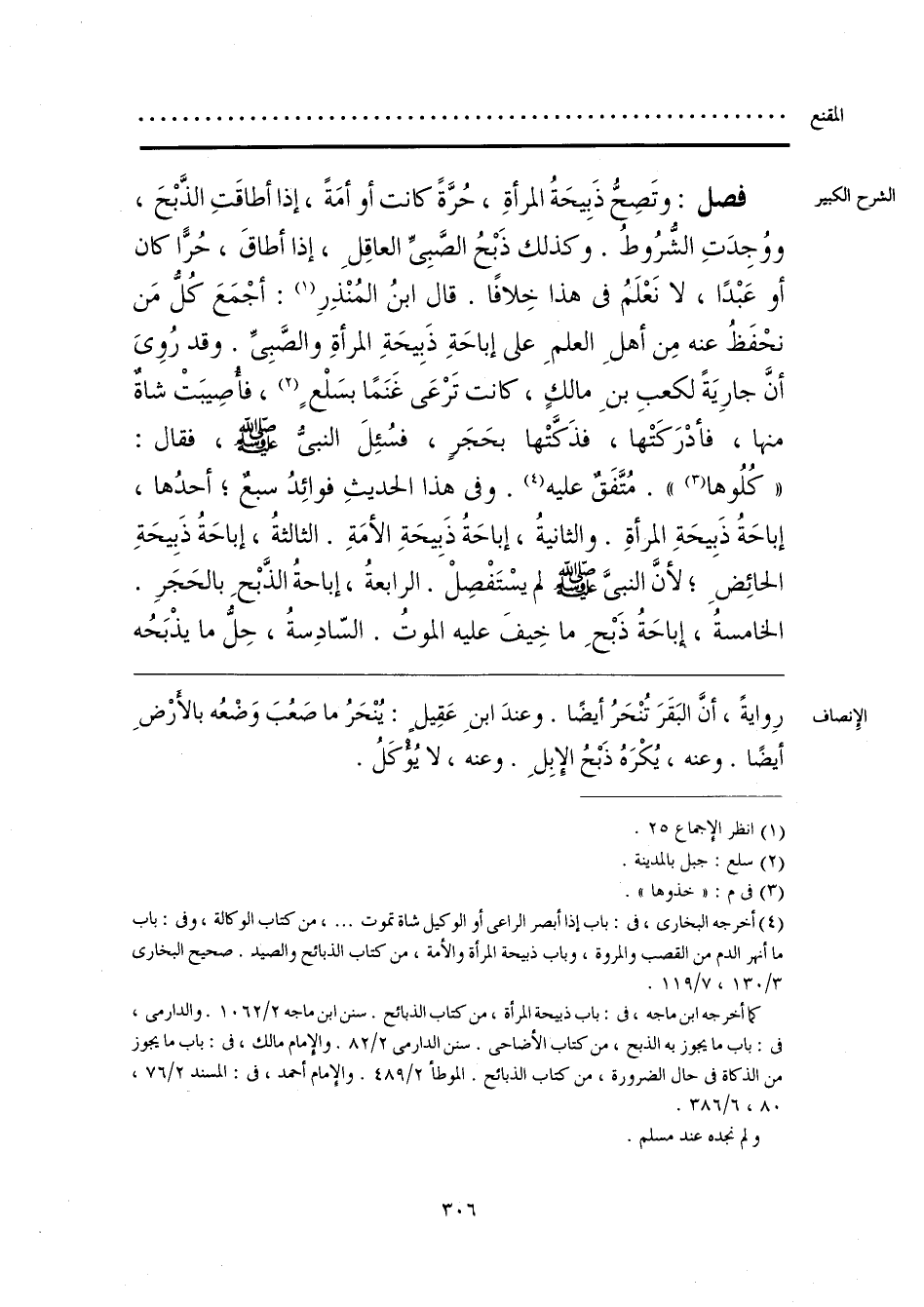 رِوايةً، أنَّ البَقَرَ تُنْحَرُ أيضًا. وعندَ ابنِ عَقِيلٍ: يُنْحَرُ ما صَعُبَ وَضْعُه بالأرْضِ أيضًا. وعنه، يُكرَهُ ذَبْحُ الإِبِلِ. وعنه، لا يُؤْكَلُ.