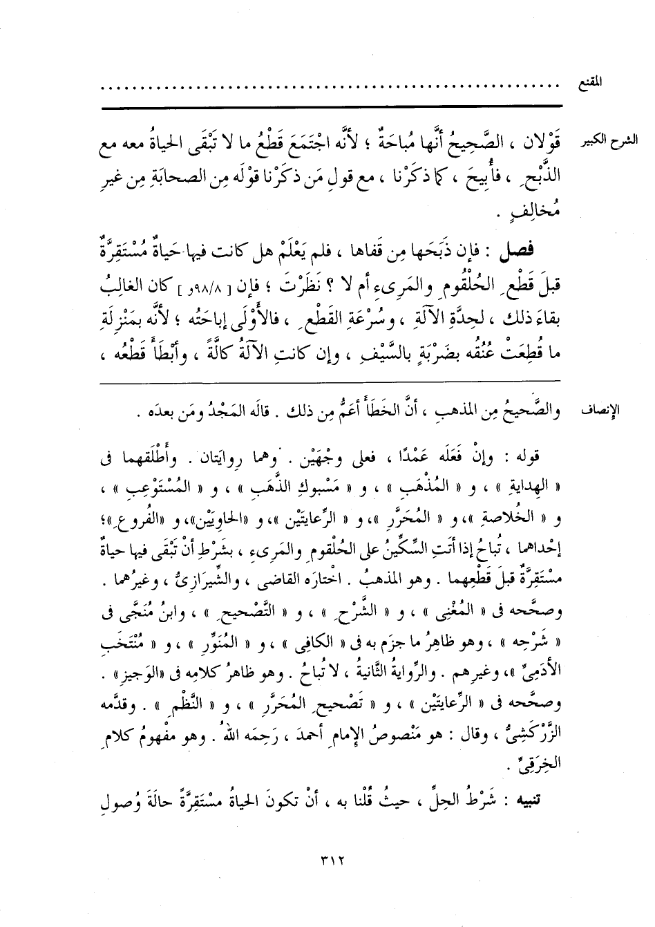 قوله: وإنْ فَعَلَه عَمْدًا، فعلى وجْهَين. وهما رِوايَتان. وأَطلَقهما في «الهِدايةِ»، و «المُذْهَبِ»، و «مَسْبوكِ الذَّهَبِ»، و «المُسْتَوْعِبِ»، و «الخُلاصةِ»، و «المُحَرَّرِ»، و «الرِّعايتَين»، و «الحاويَيْن»، و «الفُروعِ»؛ إحْداهما، تُباحُ إذا أتَتِ السِّكِّينُ على الحُلْقومِ والمَرِئِ، بشَرْطِ أنْ تَبْقَى فيها حياةٌ مسْتَقِرَّةٌ قبلَ قَطْعِهما. وهو المذهبُ. اخْتارَه القاضي، والشِّيرَازِي، وغيرُهما. وصحَّحه في «المُغْنِي»، و «الشَّرْحِ»، و «التَّصْحيحِ»، وابنُ مُنَجَّى في «شَرْحِه»، وهو ظاهِرُ ما جزَم به في «الكافِي»، و «المُنَوِّرِ»، و «مُنْتَخَبِ الأدَمِيِّ»، وغيرِهم. والرِّوايةُ الثَّانيةُ، لا تُباحُ. وهو ظاهرُ كلامِه في «الوَجيزِ». وصحَّحه في «الرِّعايتَين»، و «تَصْحيحِ المُحَرَّرِ»، و «النَّظْمِ». وقدَّمه الزَّرْكَشِيُّ، وقال: هو مَنْصوصُ الإمامِ أحمدَ، رَحِمَه اللهُ. وهو مفْهومُ كلامِ الخِرَقِيِّ.