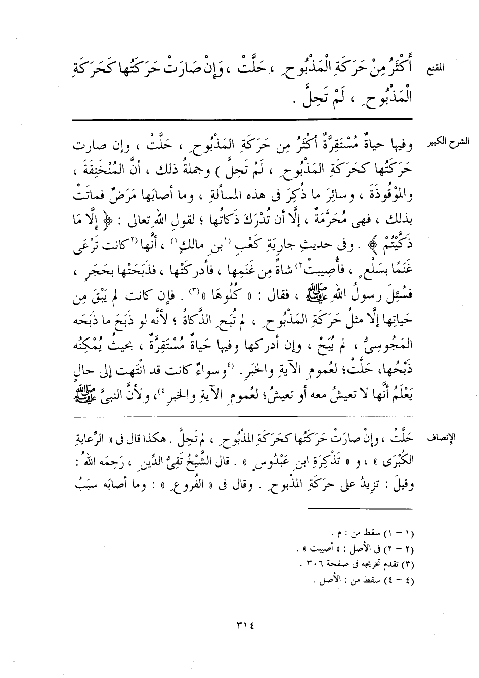 أكْثَرُ مِنْ حَرَكَةِ الْمَذْبُوحِ، حَلَّتْ، وَإنْ صَارَتْ حَرَكَتُها كَحَرَكَةِ الْمَذْبُوحِ، لَمْ تَحِلَّ.