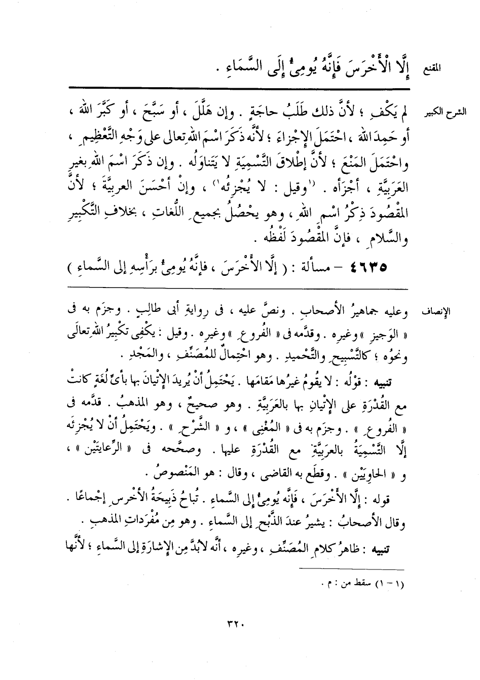 قوله: إلا الأَخْرَسَ، فَإِنَّه يُومِئُ إلى السَّماءِ. تُباحُ ذَبِيحَةُ الأخْرسَ إجْماعًا. وقال الأصحاب: يشيرُ عندَ الذَّبْحِ إلى السَّماءِ. وهو مِن مُفْرَداتِ المذهبِ.
