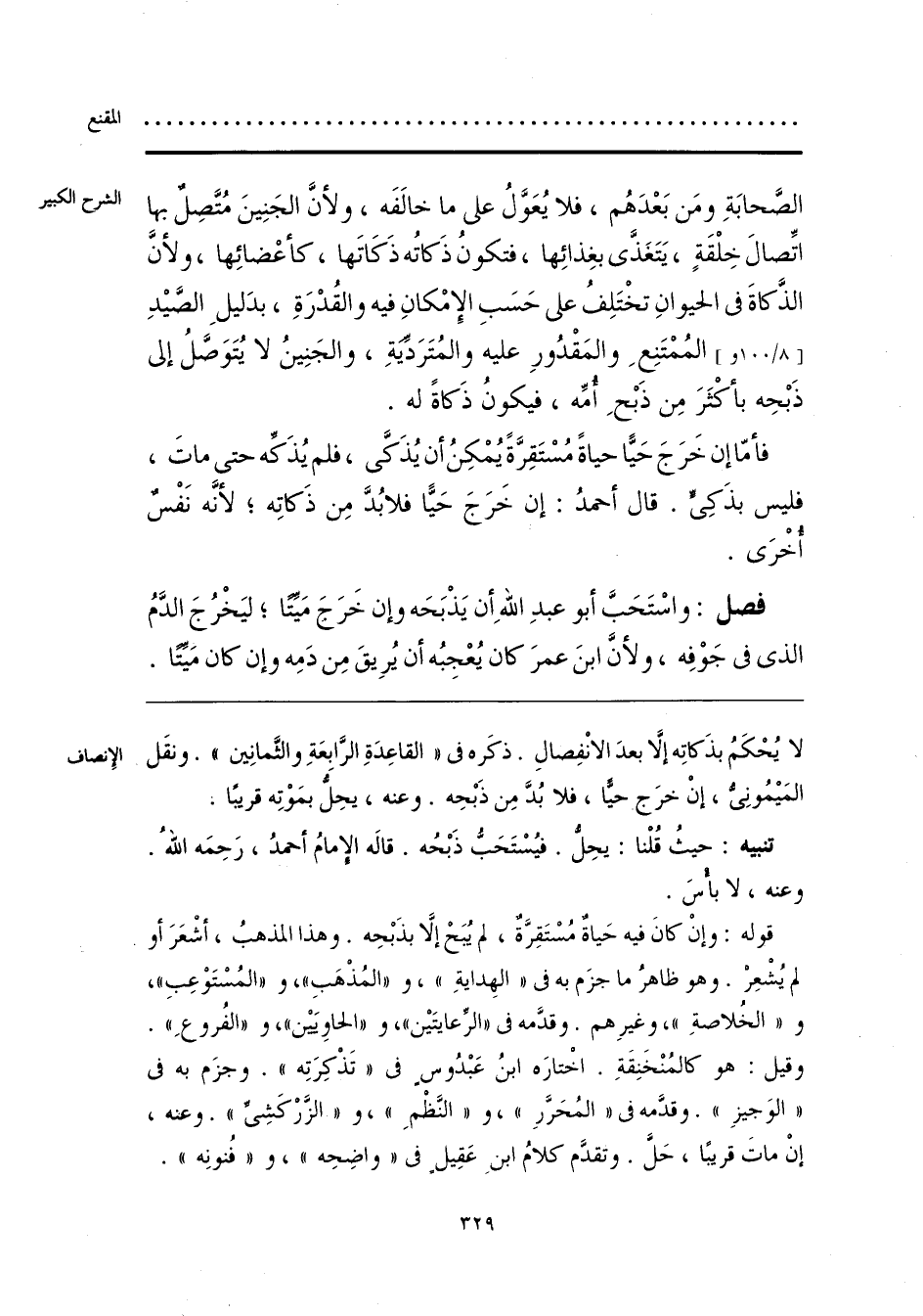 قوله: وإنْ كانَ فيه حَياةٌ مُسْتَقِرَّةٌ، لم يُبَحْ إلا بذَبْحِه. وهذا المذهبُ، أشْعَرَ أو لم يُشْعِرْ. وهو ظاهرُ ما جزَم به في «الهِدايةِ»، و «المُذْهَبِ»، و «المُسْتَوْعِبِ»، و «الخُلاصةِ»، وغيرِهم. وقدَّمه في «الرِّعايتَين»، و «الحاويَيْن»، و «الفُروعِ». وقيل: هو كالمُنْخَنِقَةِ. اخْتارَه ابنُ عَبْدُوسٍ في «تَذْكِرَتِه». وجزَم به في «الوَجيزِ». وقدَّمه في «المُحَرَّرِ»، و «النَّظْمِ»، و «الزَّرْكَشِيِّ». وعنه، إنْ ماتَ قريبًا، حَلَّ. وتقدَّم كلامُ ابنِ عَقِيلٍ في «واضحِه»، و «فُنونِه».
