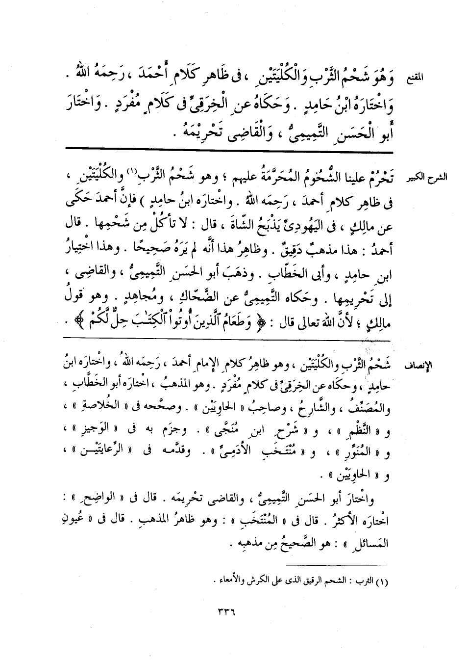 وَهُوَ شَحْمُ الثَّرْبِ وَالْكُلْيَتَينِ، في ظَاهرِ كَلَامِ أحْمَدَ، رَحِمَهُ اللهُ. وَاخْتَارَهُ ابْنُ حَامِدٍ. وَحَكَاهُ عنِ الْخِرَقِيِّ في كَلَام مُفْرَدٍ. وَاخْتَارَ أَبوْ الْحَسَنِ التَّمِيمِيُّ، وَالْقَاضِي تَحْرِيمَهُ.