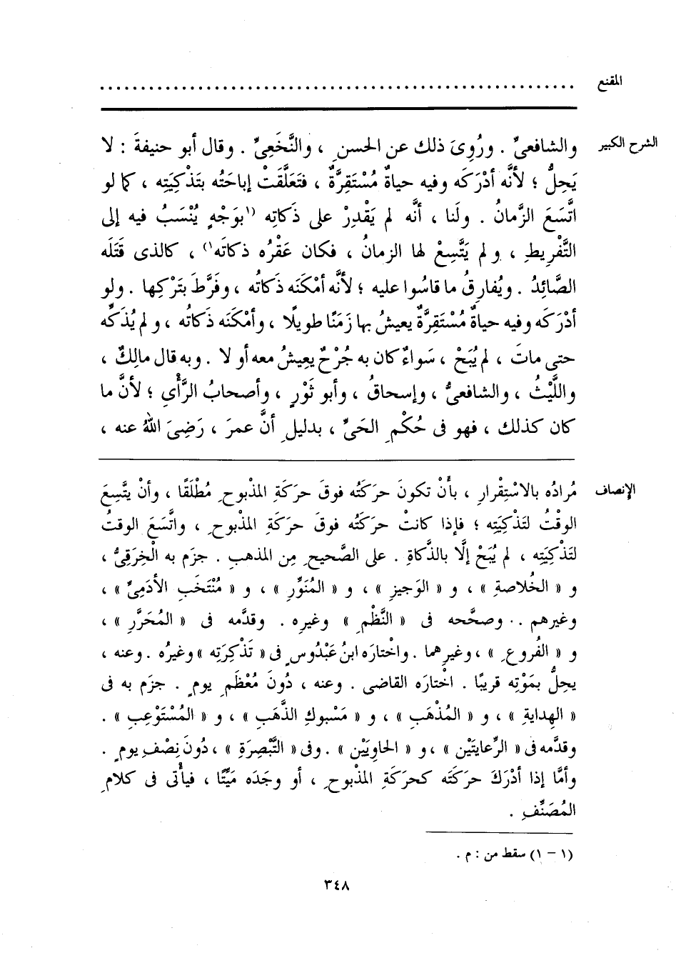 مُرادُه بالاسْتِقْرارِ، بأَنْ تكونَ حرَكَتُه فوقَ حرَكَةِ المذْبوحِ مُطْلَقًا، وأنْ يتَّسِعَ الوقْتُ لتَذْكِيَتِه؛ فإذا كانتْ حرَكَتُه فوقَ حرَكَةِ المذْبوحِ، واتَّسَعَ الوقتُ لتَذْكِيَتِه، لم يُبَحْ إلَّا بالذَّكاةِ. على الصَّحيحِ مِن المذهبِ. جزَم به الخِرَقِيُّ، و «الخُلاصةِ»، و «الوَجيزِ»، و «المُنَوِّرِ»، و «مُنْتَخَبِ الأدَمِيِّ»، وغيرهم. وصحَّحه في «النَّظْمِ» وغيرِه. وقدَّمه في «المُحَرَّرِ»، و «الفُروعِ»، وغيرِهما. واخْتارَه ابنُ عَبْدُوسٍ في «تَذْكِرَتِه» وغيرُه. وعنه، يحِلُّ بمَوْتِه قريبًا. اخْتارَه القاضي. وعنه، دُونَ مُعْظَمِ يومٍ. جزَم به في «الهِدايةِ»، و «المُذْهَبِ»، و «مَسْبوكِ الذَّهَبِ»، و «المُسْتَوْعِبِ». وقدَّمه في «الرِّعايتَين»، و «الحاويَيْن». وفي «التَّبْصِرَةِ»، دُونَ نِصْفِ يومٍ. وأمَّا إذا أدْرَكَ حرَكَتَه كحرَكَةِ المذْبوحِ، أو وجَدَه مَيَّتًا، فيأتي في كلامِ المُصَنِّفِ.