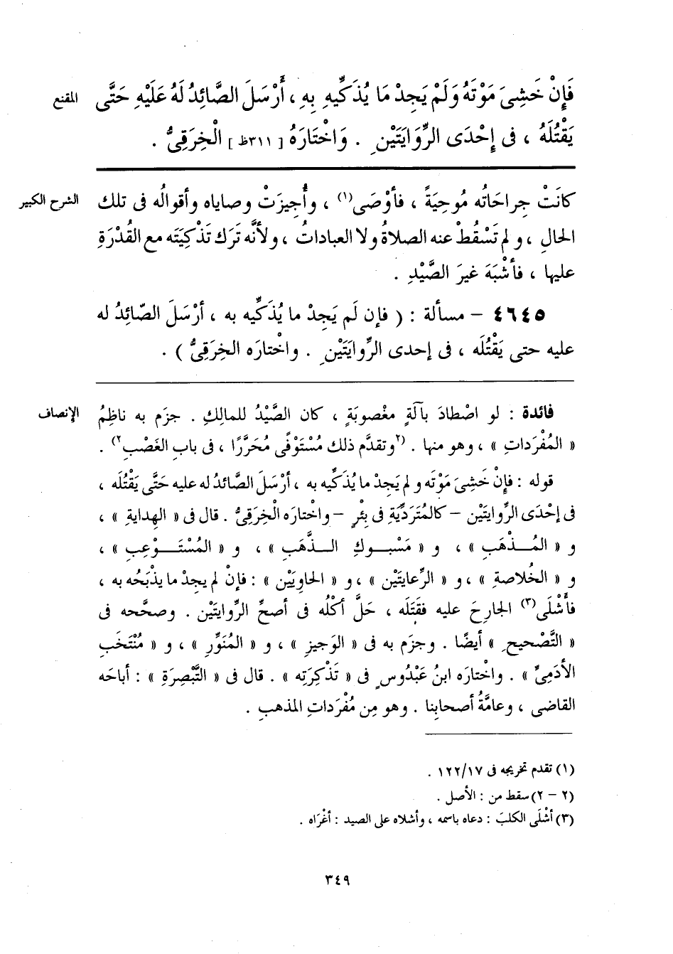 قوله: فإِنْ خَشِيَ مَوْتَه ولم يَجِدْ ما يُذَكِّيه به، أرْسَلَ الصَّائدُ له عليه حَتَّى يَقْتُلَه، في إحْدَى الرِّوايتَين -كالمُتَرَدِّيَةِ في بِئْرٍ- واخْتارَه الْخِرَقِيُّ. قال في «الهِدايةِ»، و «المُذْهَبِ»، و «مَسْبوكِ الذَّهَبِ»، و «المُسْتَوْعِبِ»، و «الخُلاصةِ»، و «الرِّعايتَين»، و «الحاويَيْن»: فإنْ لم يجِدْ ما يذْبَحُه به، فأشْلَى (¬2) الجارِحَ عليه فقتلَه، حَلَّ أكْلُه في أصحِّ الرِّوايتَين. وصحَّحه في «التَّصْحيحِ» أيضًا. وجزَم به في «الوَجيزِ»، و «المُنَوِّرِ»، و «مُنْتَخَبِ الأدَمِيِّ». واخْتارَه ابنُ عَبْدُوسٍ في «تَذْكِرَتِه». قال في «التَّبْصِرَةِ»: أباحَه القاضي، وعامَّةُ أصحابِنا. وهو مِن مُفْرَداتِ المذهبِ.