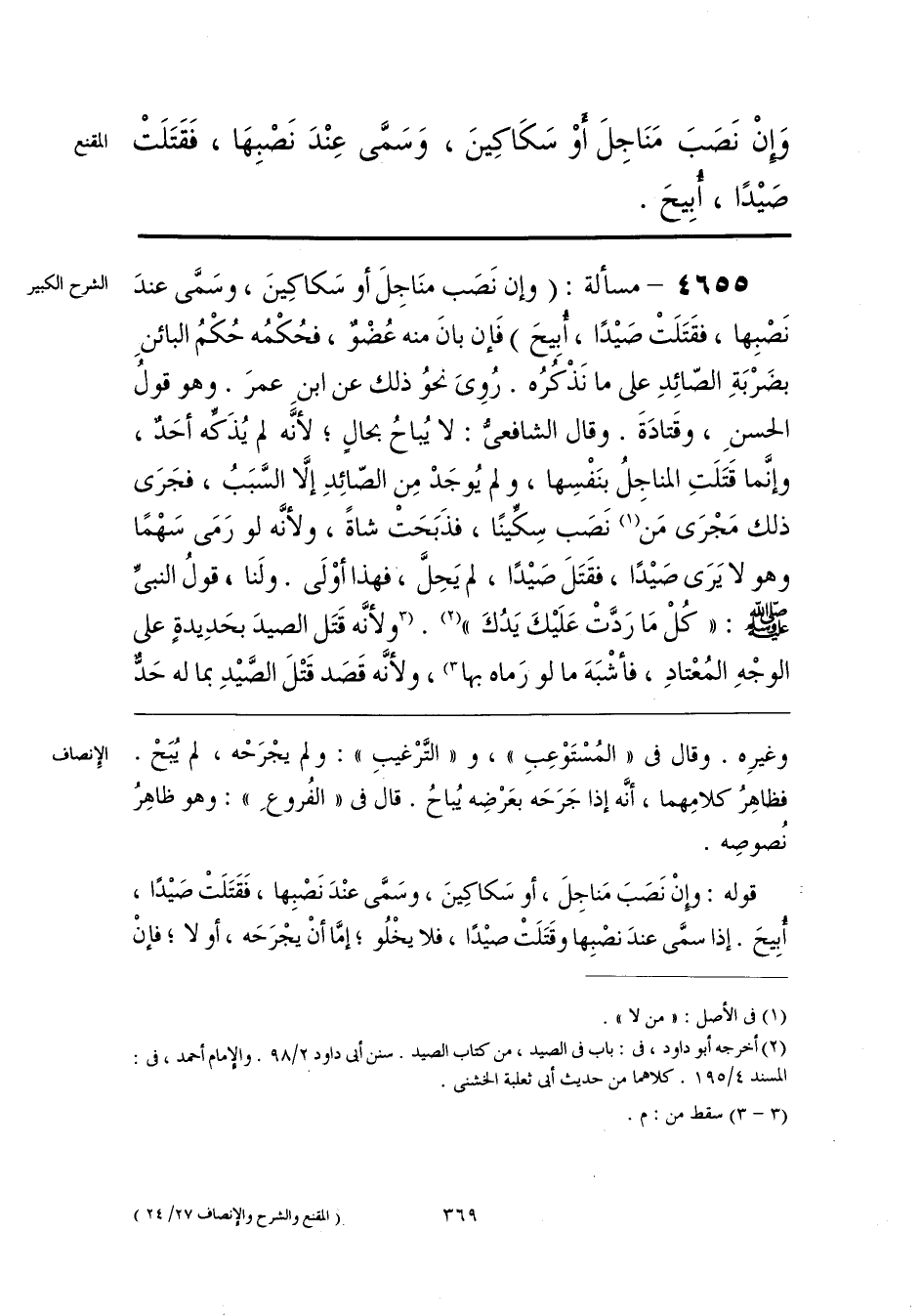 قوله: وإنْ نَصَبَ مَناجِلَ، أو سَكاكِينَ، وسَمَّى عنْدَ نَصْبِها، فَقَتَلَتْ صَيدًا، أُبِيحَ. إذا سمَّى عندَ نصْبِها وقَتَلَتْ صيدًا، فلا يخْلُو، إمَّا أنْ يجْرَحَه، أو لا؛ فإنْ