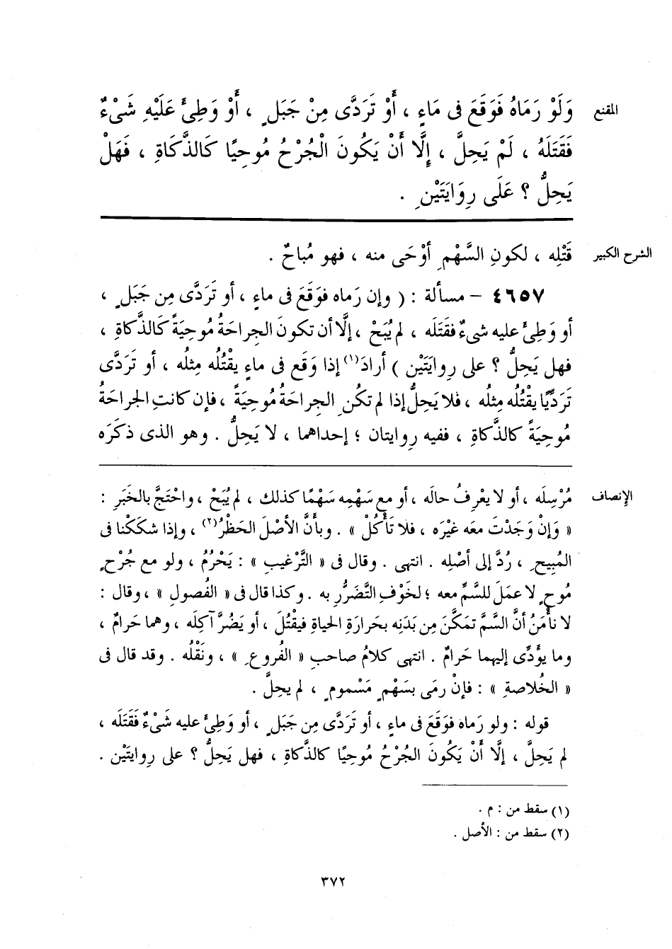 وَلَوْ رَمَاهُ فَوَقَعَ في مَاءٍ، أوْ تَرَدَّى مِنْ جَبَلٍ، أوْ وَطِئَ عَلَيهِ شَيْءٌ فَقَتَلَهُ، لَمْ يَحِلَّ، إلا أن يَكُونَ الْجُرْحُ مُوحِيًا كَالذَّكَاةِ، فَهَلْ يَحِلُّ؟ عَلَى رِوَايَتَينِ.