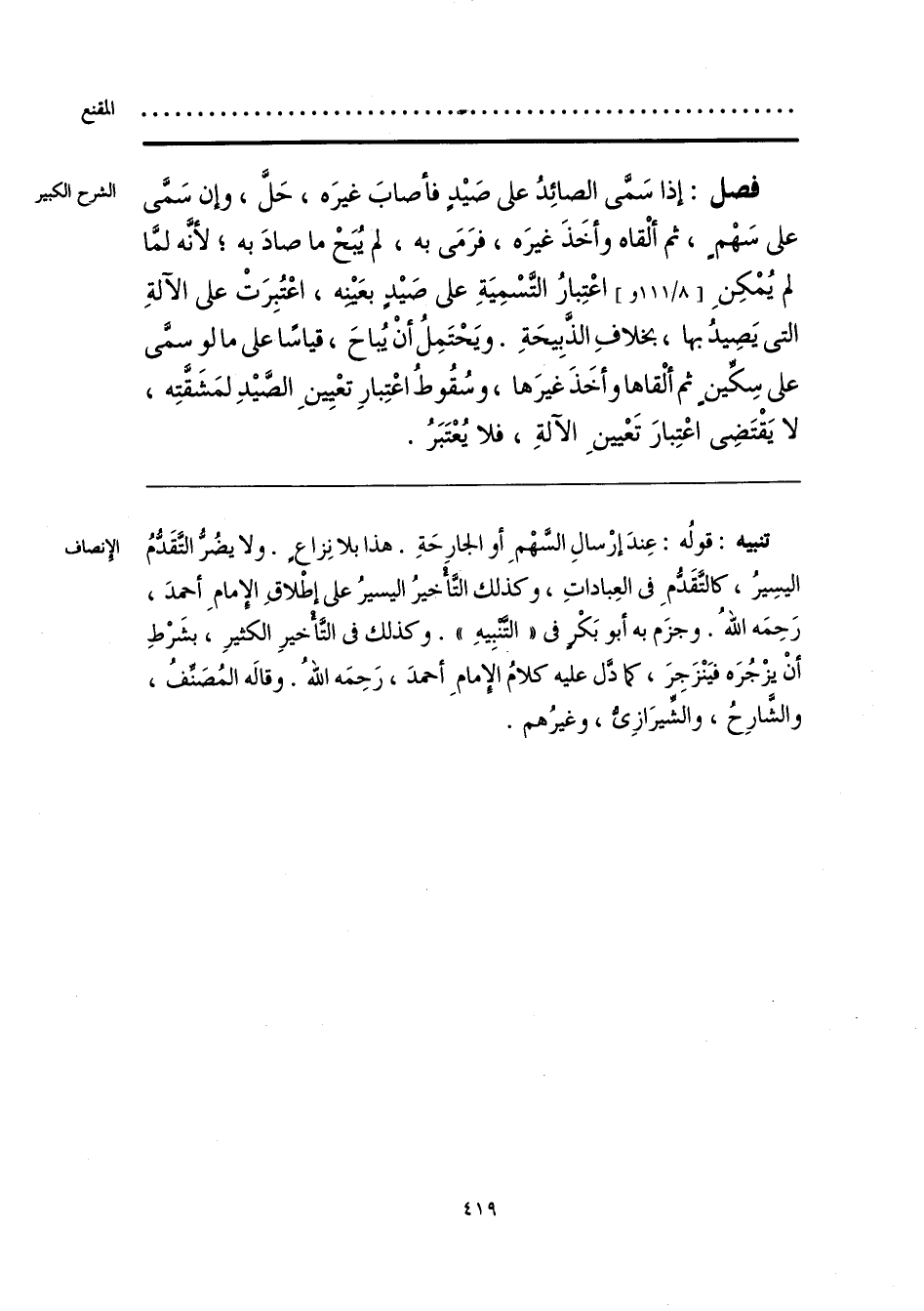 تنبيه: قولُه: عِندَ إرْسالِ السَّهْمِ أو الجارِحَةِ. هذا بلا نِزاعٍ. ولا يضُرُّ التَّقَدُّمُ اليسِيرُ، كالتَّقَدُّمِ في العِباداتِ، وكذلك التَّأْخيرُ اليسيرُ على إطْلاقِ الإِمامِ أحمدَ، رَحِمَه اللهُ. وجزَم به أبو بَكْرٍ في «التَّنْبِيهِ». وكذلك في التَّأْخيرِ الكثيرِ، بشَرْطِ أنْ يزْجُرَه فيَنْزَجِرَ، كما دلَّ عليه كلامُ الإِمامِ أحمدَ، رَحِمَه اللهُ. وقاله المُصَنِّفُ، والشَّارِحُ، والشِّيرَازِيُّ، وغيرُهم.