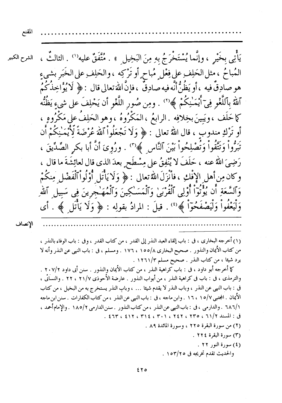 يَأْتِي بِخَيرٍ، وإنَّما يُسْتَخْرَجُ بِهِ مِنَ البَخِيلِ». مُتَّفَقٌ عليه (¬1). الثالثُ، المُباحُ، مثل الحَلِفِ على فِعْلٍ مُباحٍ أو تَرْكِه، والحَلِفِ على الخَبَرِ بشيءٍ هو صادِقٌ فيه، أو يَظُنُّ أنَّه فيه صادِقٌ، فإنَّ اللهَ تعالى قال: {لَا يُؤَاخِذُكُمُ اللَّهُ بِاللَّغْو فِي أَيمَانِكُمْ} (¬2). ومِن صُورِ اللَّغْو أن يَحْلِفَ على شيءٍ يَظُنُّه كما حَلَف، ويَبِينَ بخِلافِه. الرابعُ، المَكْرُوهُ، وهو الحَلِفُ على مَكْرُوهٍ، أو تَرْكِ مندوبٍ، قال اللهُ تعالى: {وَلَا تَجْعَلُوا اللَّهَ عُرْضَةً لِأَيمَانِكُمْ أَنْ تَبَرُّوا وَتَتَّقُوا وَتُصْلِحُوا بَينَ النَّاسِ} (¬3). ورُوِيَ أنَّ أبا بكرٍ الصِّدِّيقَ، رَضِيَ اللهُ عنه، حَلَفَ لا يُنْفِقُ على مِسْطَحٍ بعدَ الذي قال لعائِشةَ ما قال، وكان مِن أهلِ الإفْكِ، فأنْزَلَ اللهُ تعالى: {وَلَا يَأْتَلِ أُولُو الْفَضْلِ مِنْكُمْ وَالسَّعَةِ أَنْ يُؤْتُوا أُولِي الْقُرْبَى وَالْمَسَاكِينَ وَالْمُهَاجِرِينَ فِي سَبِيلِ اللَّهِ وَلْيَعْفُوا وَلْيَصْفَحُوا} (¬4). قيلَ: المرادُ بقولِه: {وَلَا يَأْتَلِ}. أي
