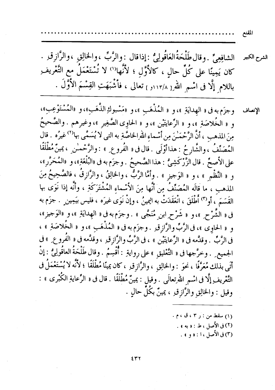 وجزَم به في «الهِدايَةِ»، و «المُذْهَبِ»، و «مَسْبوكِ الذَّهَبِ»، و «المُسْتَوْعِبِ»، و «الخُلاصَةِ»، و «الرِّعايتَين»، و «الحاوي الصَّغِيرِ»، وغيرِهم. والصَّحيحُ مِنَ المذهبِ، أنَّ الرَّحْمَنَ مِن أسْماءِ اللهِ الخاصَّةِ به التي لا يُسَمَّى بها (¬1) غيرُه. قال المُصَنِّفُ، والشَّارِحُ: هذا أوْلَى. قال في «الفُروعِ»: والرَّحْمنِ، يمينٌ مُطْلَقًا على الأصحِّ. قال الزَّرْكَشِيُّ: هذا الصَّحيحُ. وجزَم به في «البُلْغَةِ»، و «المُحَرَّرِ»، و «النَّظْمِ»، و «الوَجيزِ». وأمَّا الرَّبّ، والخالِقُ، والرَّازِقُ، فالصَّحِيحُ مِنَ المذهبِ، ما قاله المُصَنِّفُ مِن أنَّها مِنَ الأسْماءِ المُشْتَرَكَةِ، وأنَّه إذا نَوَى بها القَسَمَ، أو (¬2) أَطْلَقَ، انْعَقَدَتْ به اليمينُ، وإنْ نَوَى غيرَه، فليس بيَمِينٍ. جزَم به في «الشَّرْحِ»، و «شَرْحِ ابنِ مُنَجَّى». وجزَم به في «الهِدايَةِ»، و «الوَجيزِ»، و «الحاوي»، في الرَّبِّ والرَّازِقِ. وجزَم به في «المُذْهَبِ»، و «الخُلاصَةِ»، في الرَّبِّ. وقدَّمه في «الرِّعايتَين»، في الرَّبِّ والرَّازِقِ، وقدَّمه في «الفُروعِ» في الجميعِ. وخرَّجها في «التَّعْليقِ» على رِوايةِ: أُقْسِمُ. وقال طَلْحَةُ العاقُولِيُّ: إنْ أتَى بذلك مُعَرَّفًا، نحوَ: والخالِقِ، والرَّازِقِ، كان يمينًا مُطْلَقًا؛ لأنَّه لا يُسْتَعْمَلُ في التَّعْريفِ إلَّا في اسْمِ اللهِ تعالى. وقيل: يمينٌ مُطْلَقًا. قال في «الرِّعايةِ الكُبْرى»: وقيل: والخالِقِ والرَّازِقِ، يمينٌ بكُلِّ حالٍ.