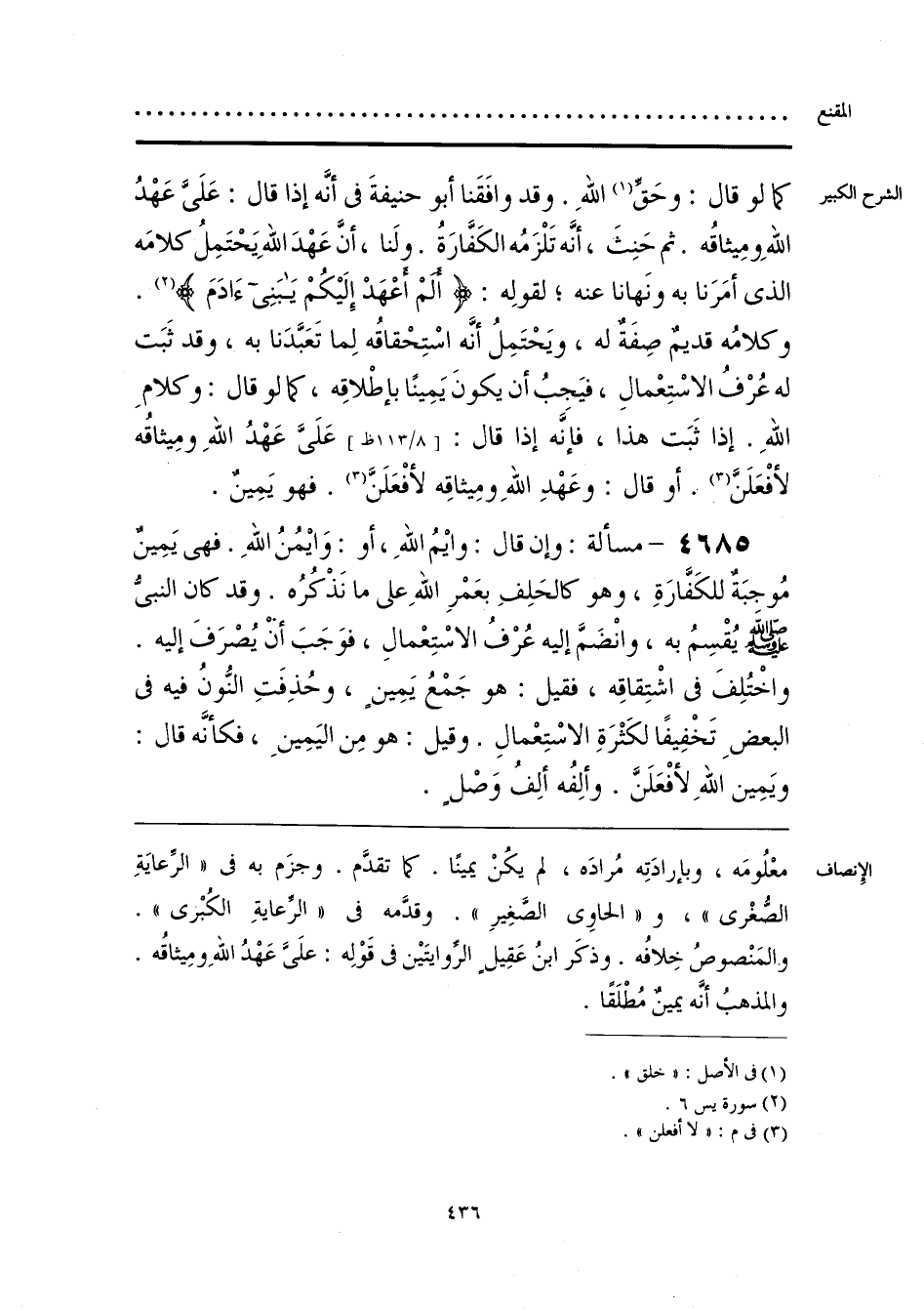 معْلُومَه، وبإرادَتِه مُرادَه، لم يكُنْ يمينًا. كما تقدَّم. وجزَم به في «الرِّعايَةِ الصُّغْرى»، و «الحاوي الصَّغِيرِ». وقدَّمه في «الرِّعايةِ الكُبْرى». والمَنْصوصُ خِلافُه. وذكَر ابنُ عَقِيلٍ الرِّوايتَين في قَوْلِه: علَيَّ عَهْدُ اللهِ ومِيثاقُه. والمذهبُ أنَّه يمينٌ مُطْلَقًا.