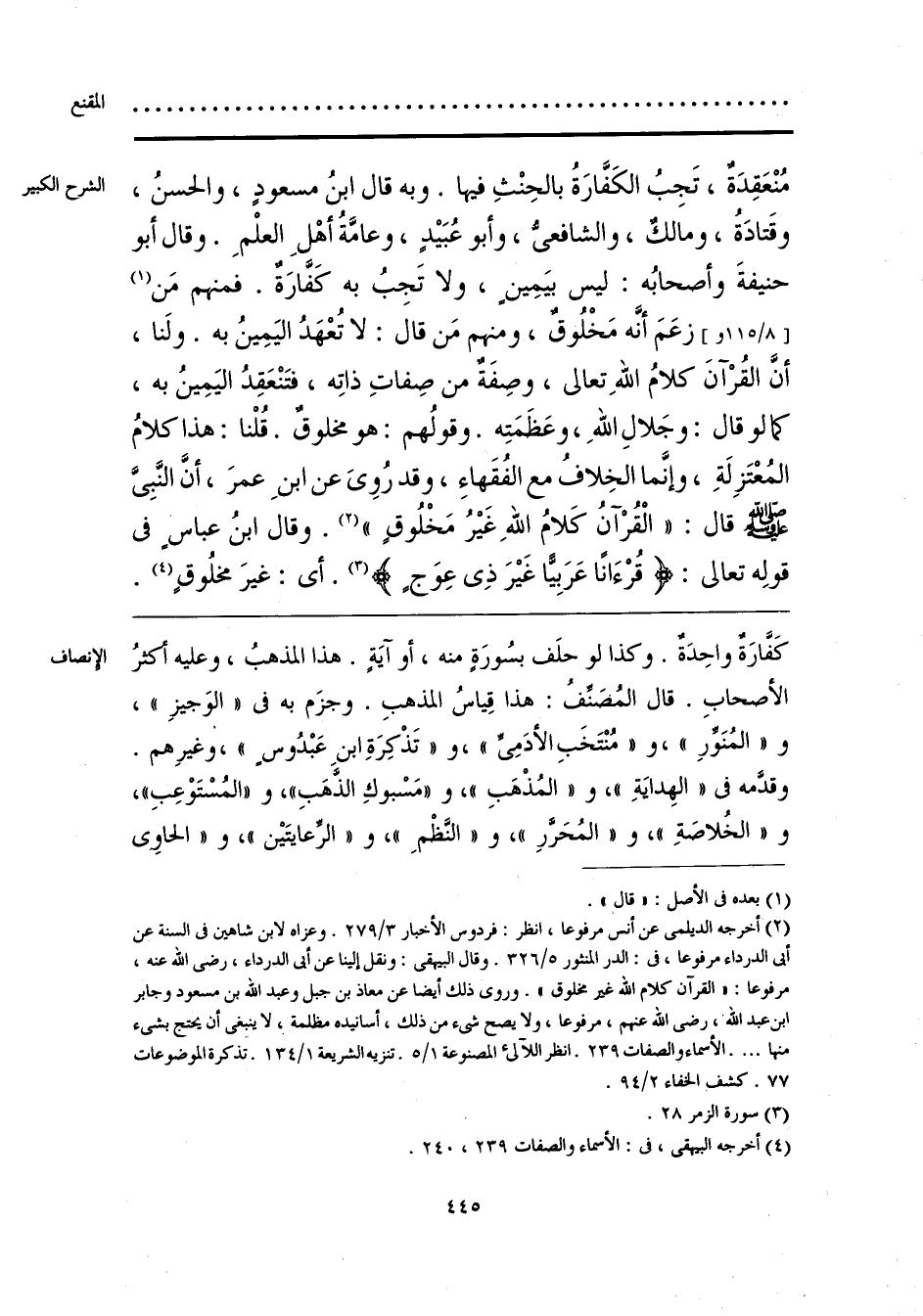 كَفَّارَةٌ واحِدَةٌ. وكذا لو حلَف بسُورَةٍ منه، أو آيَةٍ. هذا المذهبُ، وعليه أكثرُ الأصحابِ. قال المُصَنِّفُ: هذا قِياسُ المذهبِ. وجزَم به في «الوَجيزِ»، و «المُنَوِّرِ»، و «مُنْتَخَبِ الأدَمِيِّ»، و «تَذْكِرَةِ ابنِ عَبْدُوسٍ»، وغيرِهم. وقدَّمه في «الهِدايَةِ»، و «المُذْهَبِ»، و «مَسْبوكِ الذَّهَبِ»، و «المُسْتَوْعِبِ»، و «الخُلاصَةِ»، و «المُحَرَّرِ»، و «النَّظْمِ»، و «الرِّعايتَين»، و «الحاوي