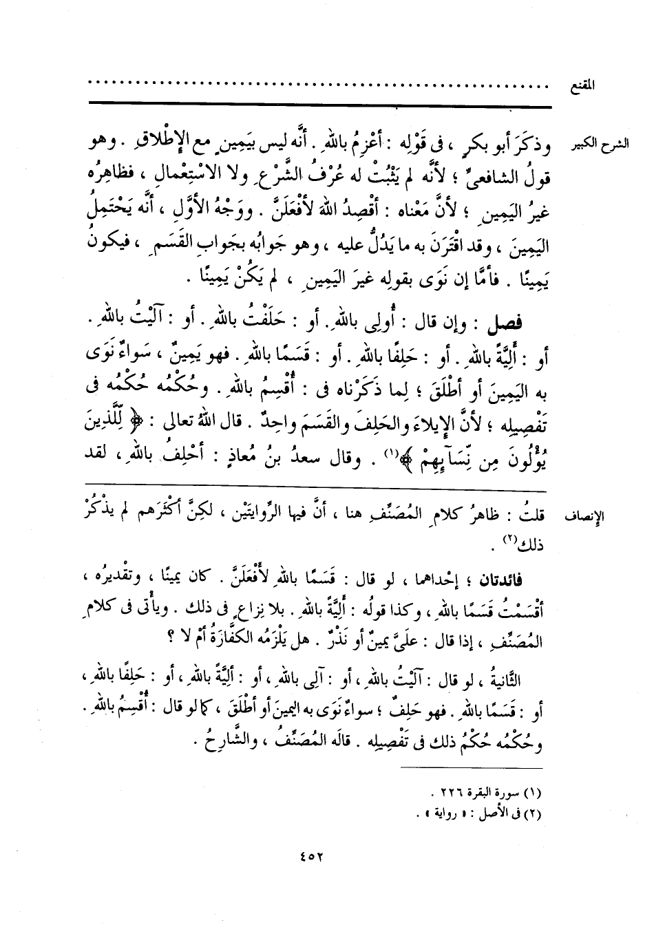 فائدتان؛ إحْداهما، لو قال: قَسَمًا باللهِ لَأفْعَلَنَّ. كان يمينًا، وتقْديرُه، أقْسَمْتُ قَسَمًا باللهِ، وكذا قولُه: أَلِيَّةً باللهِ. بلا نِزاعٍ في ذلك. ويأْتي في كلامِ المُصَنِّفِ، إذا قال: علَيَّ يمينٌ أو نَذْرٌ. هل يَلْزَمُه الكفَّارَةُ أُمْ لا؟