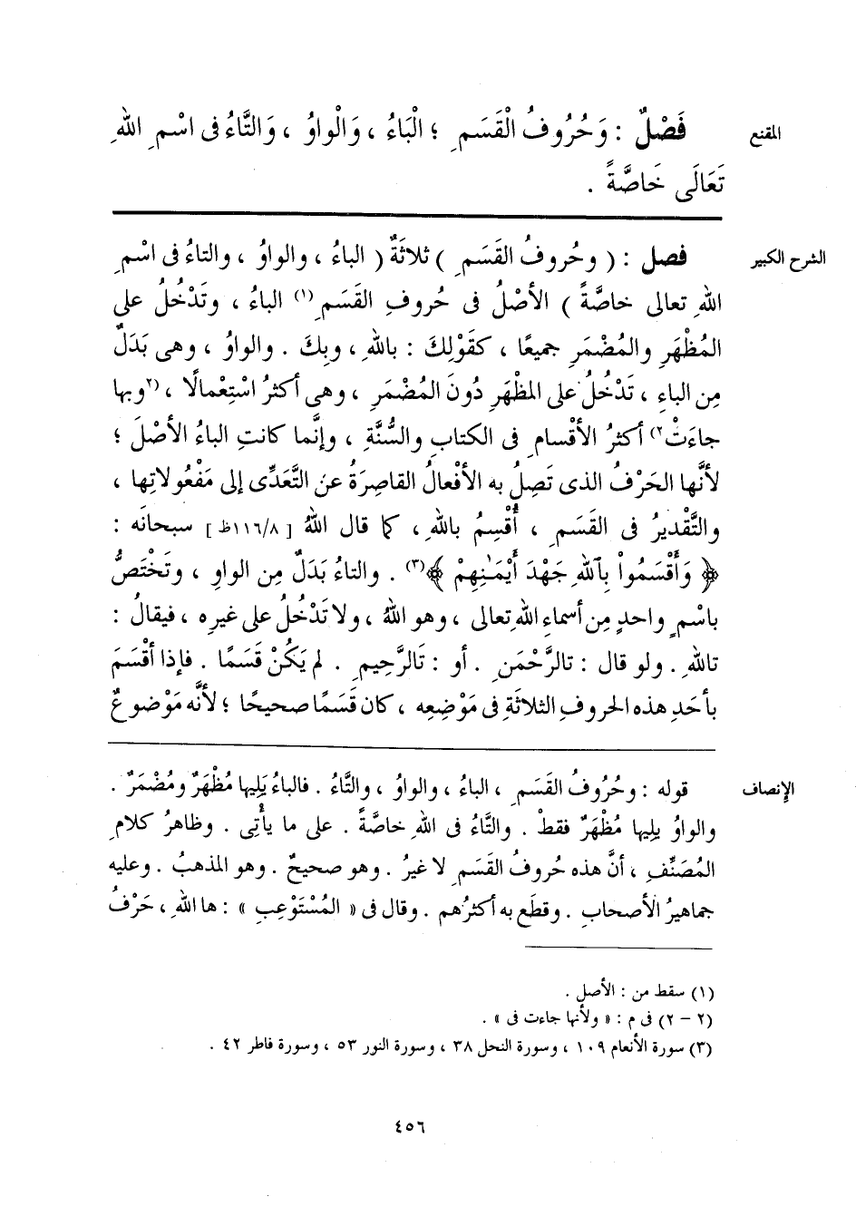 فَصْلٌ: وَحُرُوفُ الْقَسَم؛ الْبَاءُ، وَالْواوُ، وَالتَّاءُ فِي اسْمِ اللهِ تَعَالى خَاصَّةً.