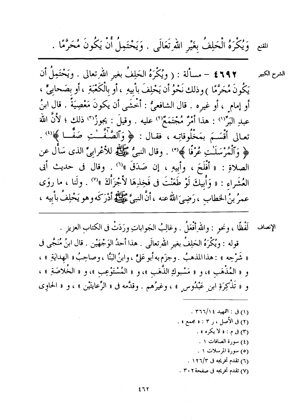 قوله: ويُكْرَهُ الحَلِفُ بغيرِ اللهِ تعالى. هذا أحدُ الوَجْهَين. قال ابنُ مُنَجَّى في «شَرْحِه»: هذا المذهبُ. وجزَم به أبو عَليٍّ، وابنُ البَنَّا، وصاحِبُ «الهِدايَةِ»، و «المُذْهَبِ»، و «مَسْبوكِ الذَّهَبِ»، و «المُسْتَوْعِبِ»، و «الخُلاصَةِ»، و «تَذْكِرَةِ ابنِ عَبْدُوسٍ»، وغيرُهم. وقدَّمه في «الرِّعايتَين»، و «الحاوي